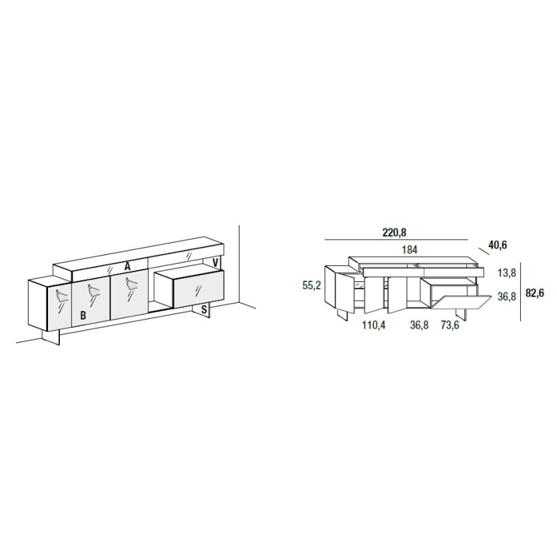 Dans cette composition, vous pouvez personnaliser votre composition de buffet. 2109 avec finitions laquées, verre brillant ou verre mat. De plus, vous pouvez choisir d'insérer les supports en verre extra-clair ou gris fumé.