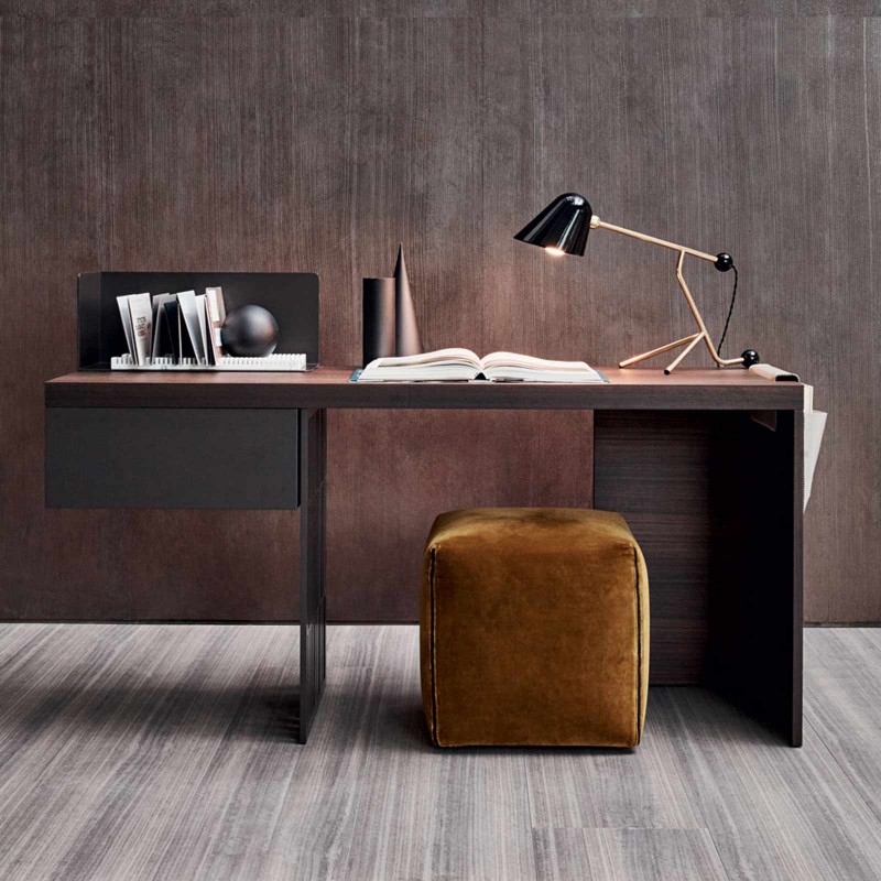 Un meuble idéal pour aménager un espace bureau à domicile pour ceux qui font du smartworking, à installer dans n'importe quelle pièce de la maison, Scriba est en bois et dispose d'un tiroir latéral pratique. Le bureau peut être complété par une poche latérale en cuir et un support serre-livres en tôle laquée.