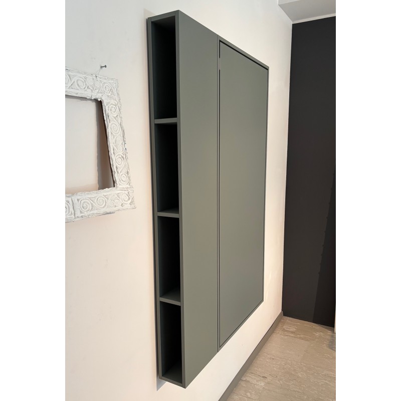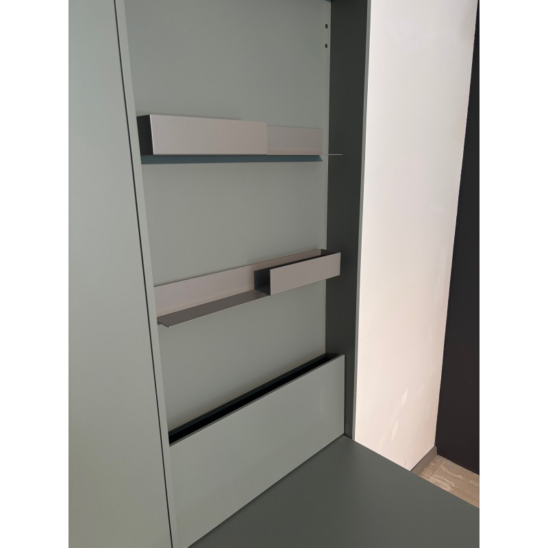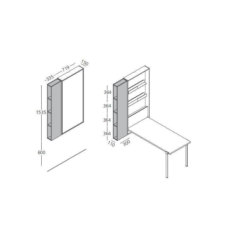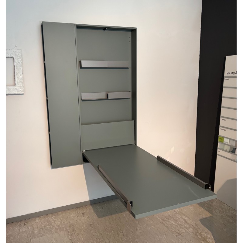 Wally Office de Clei est un élément de rangement d'une profondeur de 15 cm seulement, équipé d'une table/bureau intégrée et d'une ouverture rabattable. D'un simple mouvement, les pieds métalliques situés sur le côté du plateau se libèrent et se verrouillent en position de service. Une solution pratique et peu encombrante, idéale pour le coin bureau à la maison. Équipée de 2 étagères internes avec rails en tôle pour le rangement des appareils, disponible avec éclairage LED en haut et en bas.