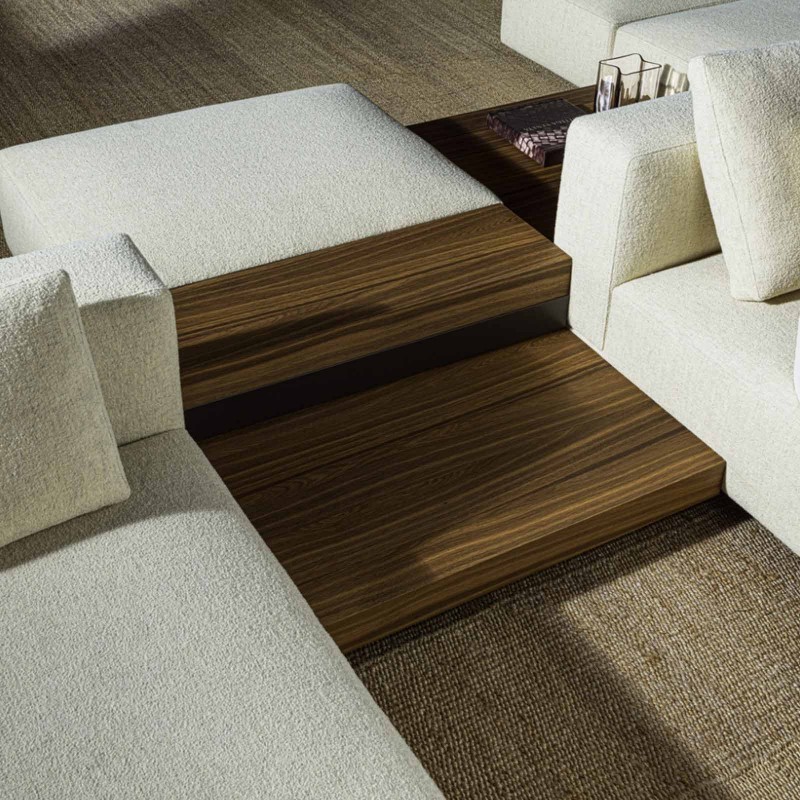 Le module terminal peut être revêtu de tissu ou de cuir, sur lequel se superposent des dossiers, des accoudoirs bas et hauts, enrichis de bacs en bois ou laqués.