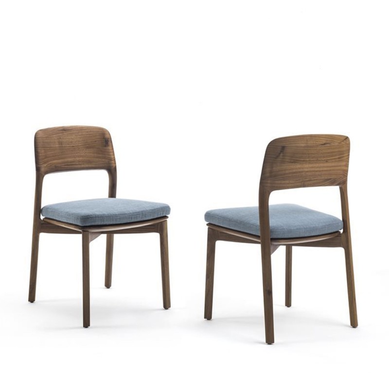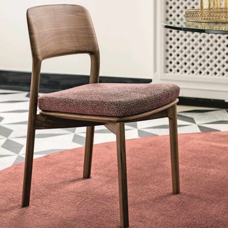 Une chaise qui révèle le travail exquis du noyer canaletta massif: Emma de Porada est un siège au design informel, parfait pour le salon. L'assise est rembourrée et disponible dans tous les tissus de la gamme Porada. Pieds avec extrémités en nylon.
