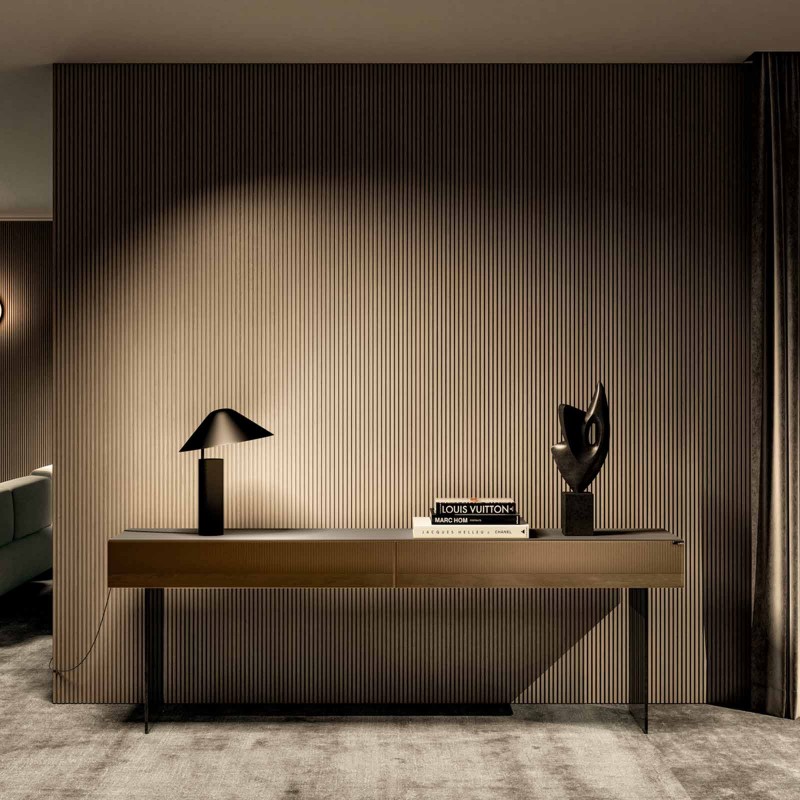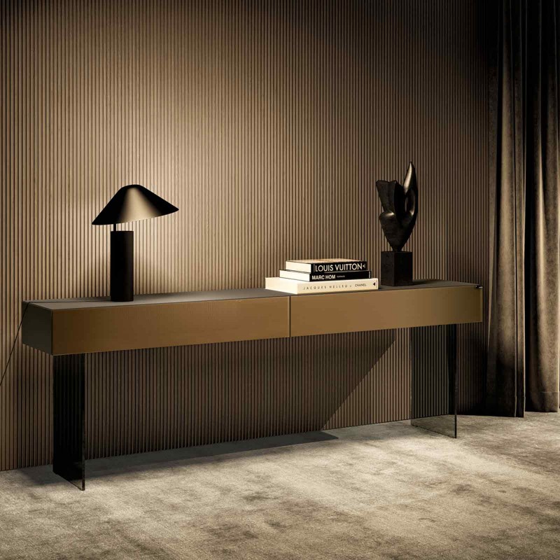 La console 36e8 est une nouveauté Lago présentée au Supersalone 2021. Une solution parfaite pour meubler une entrée ou un couloir, la console 36e8 a une finition élégante à 45 degrés qui la rend à la fois sophistiquée et fonctionnelle. Dans cette version, il est proposé avec deux tiroirs avec des façades disponibles en différentes finitions : verre laqué, brillant ou mat, Xglass ou wildwood. Les pieds peuvent être en verre finition extra clair transparent, gris fumé ou bronze fumé ou en métal finition étain ou acier titane.