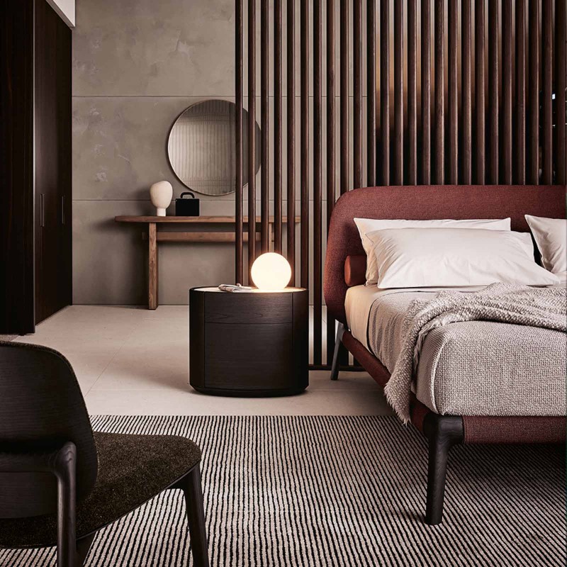 Curve est le lit Poliform, une nouveauté du Salone del Mobile 2022, qui marque une nouvelle étape dans le chemin stylistique et dans la recherche d'un style intemporel si cher à la marque. Curve est le projet d'Emmanuel Gallina qui combine bois massif et rembourrage dans un lit avec pieds et avec une tête de lit rembourrée, douce et confortable à tout moment, disponible en tissu ou en cuir. La structure est disponible en chêne spessart ou en orme noir.