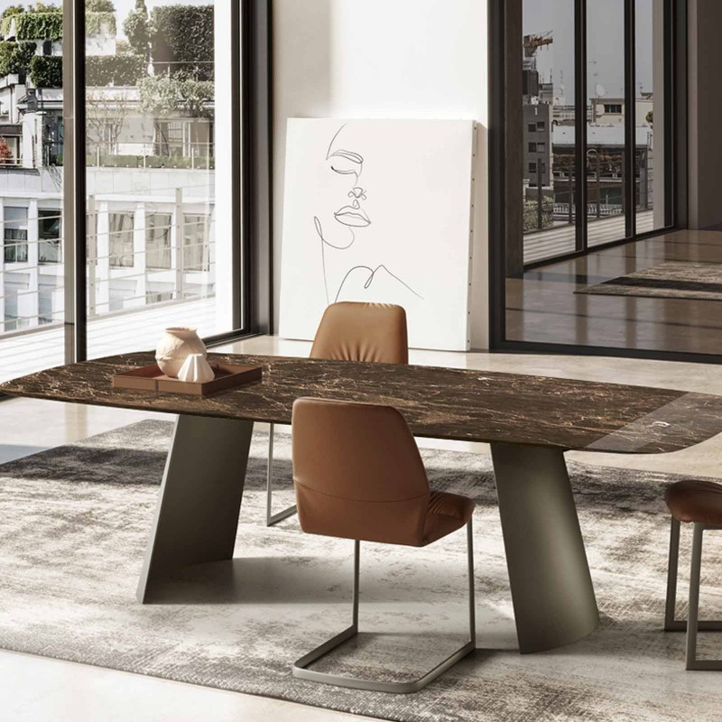 Dorian est la table Eforma avec une base en métal et un plateau en marbre brillant rectangulaire ou façonné avec des bords obliques de 20 mm d'épaisseur. Dorian se caractérise par une base à la fois légère et sculpturale. Une table parfaite pour meubler la salle à manger ou les bureaux de direction.