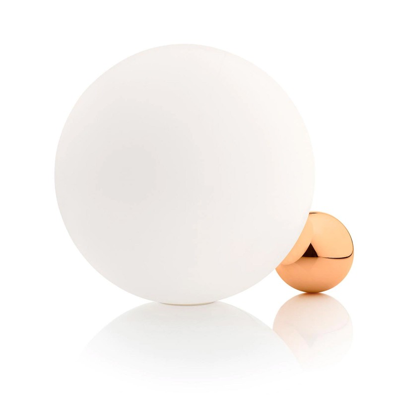 Copycat est une lampe à poser composée d'une sphère en aluminium usinée dans la masse puis dorée au bain d'or 24 K. Diffuseur en verre soufflé opale. Source de lumière LED avec gradateur le long du câble d'alimentation.