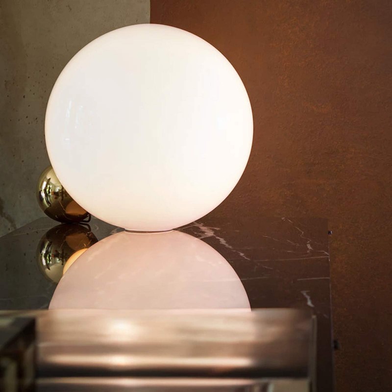 Lampe de table composée d'une sphère en aluminium usinée dans la masse puis dorée dans un bain d'or 24K. Diffuseur opalin en verre soufflé. Lampe LED avec variateur sur le câble d'alimentation.