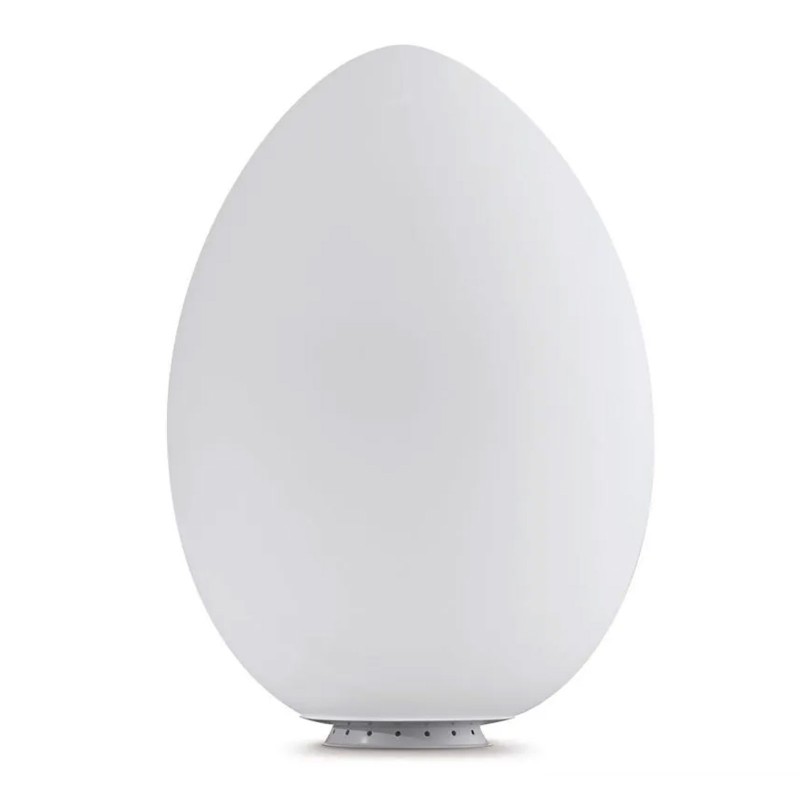 Uovo par FontanaArte se compose d’un diffuseur en polyéthylène blanc satiné réalisé grâce à la technique de l’estampage rotatif et est complété par une structure en acier inoxydable.