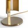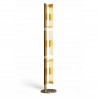 Les panneaux métalliques incurvés, disposés selon une séquence rythmique, dialoguent avec les trois tubes lumineux verticaux. La finition des panneaux, en aluminium anodisé laiton, confère une élégance intemporelle, tandis que le contraste entre les autres surfaces en laiton et les sources lumineuses accentue la tridimensionnalité de l'objet.