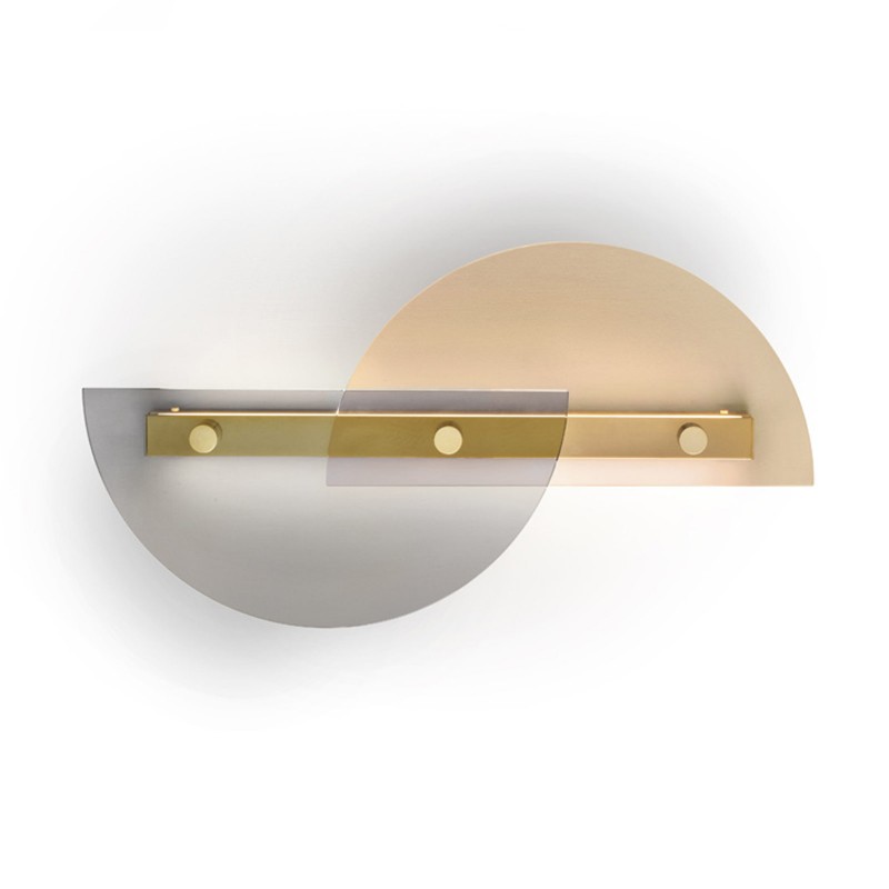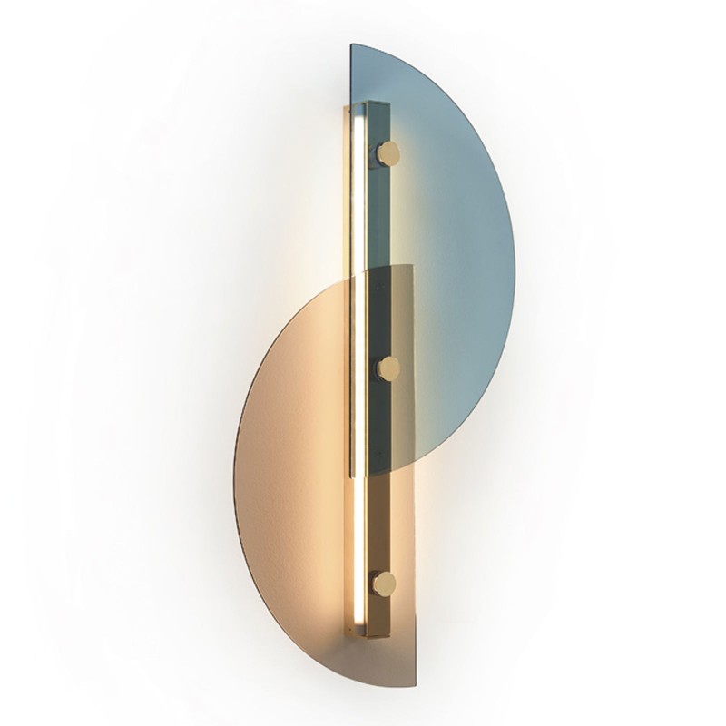 La lampe Papillon joue avec des transparents , des couleurs et des formes géométriques . Les deux LED sont intégrés bande la tige centrale avec finition dorée , qui agit comme un support aux deux verres colorés .
