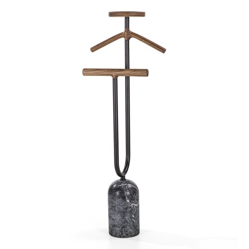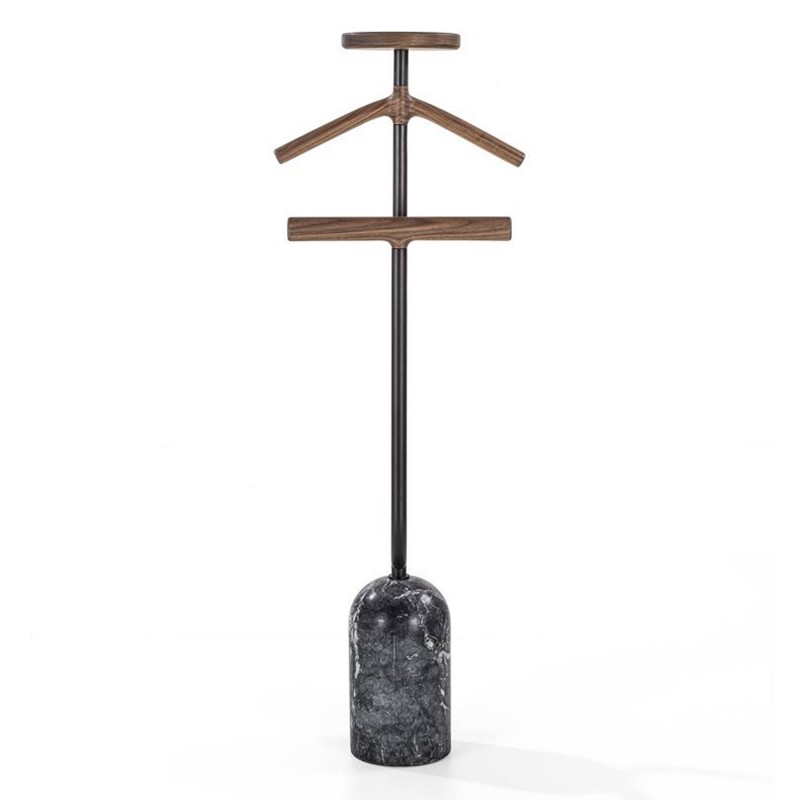 Ekero Rack de Porada est le valet de chambre où fonctionnalité rime avec esthétique. Une base cylindrique sculpturale en marbre soutient la structure en noyer canaletta massif. Le porte-pantalon a un insert antidérapant en microfibre grise et un vide-poches recouvert de cuir Cuoietto.
