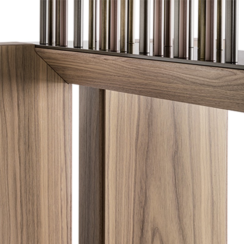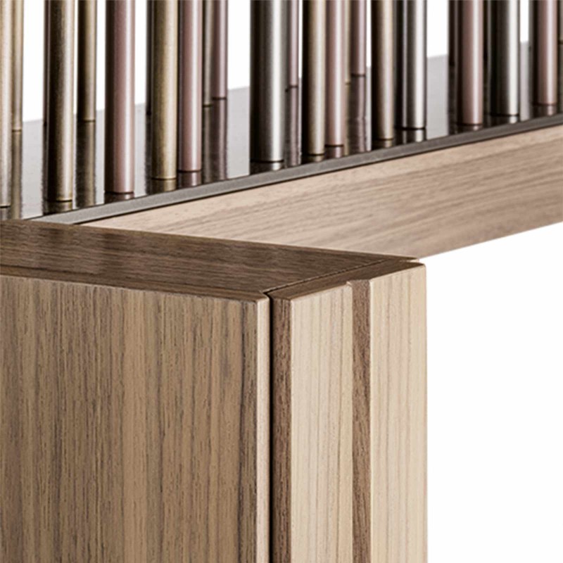 Le table G-Code de Giorgetti conçue par Dante O. Benini et Luca Gonzo est une nouveauté 2023 à fort impact visuel. L'élément qui rend G-Code unique est la structure métallique composée de 92 cylindres de trois tailles et finitions différentes. L'inspiration de cette grille porteuse qui unit le dessus et le contenant sous-jacent vient, comme l'a déclaré Benini, d'un voyage aux États-Unis de l'observation de la brosse de la trousse de courtoisie dans l'avion, imaginant ainsi que la texture de l'objet pourrait devenir un architectural avec la fonction de poutre pour un grand étage.