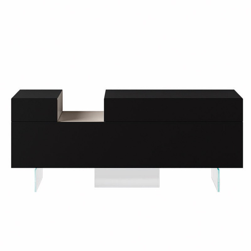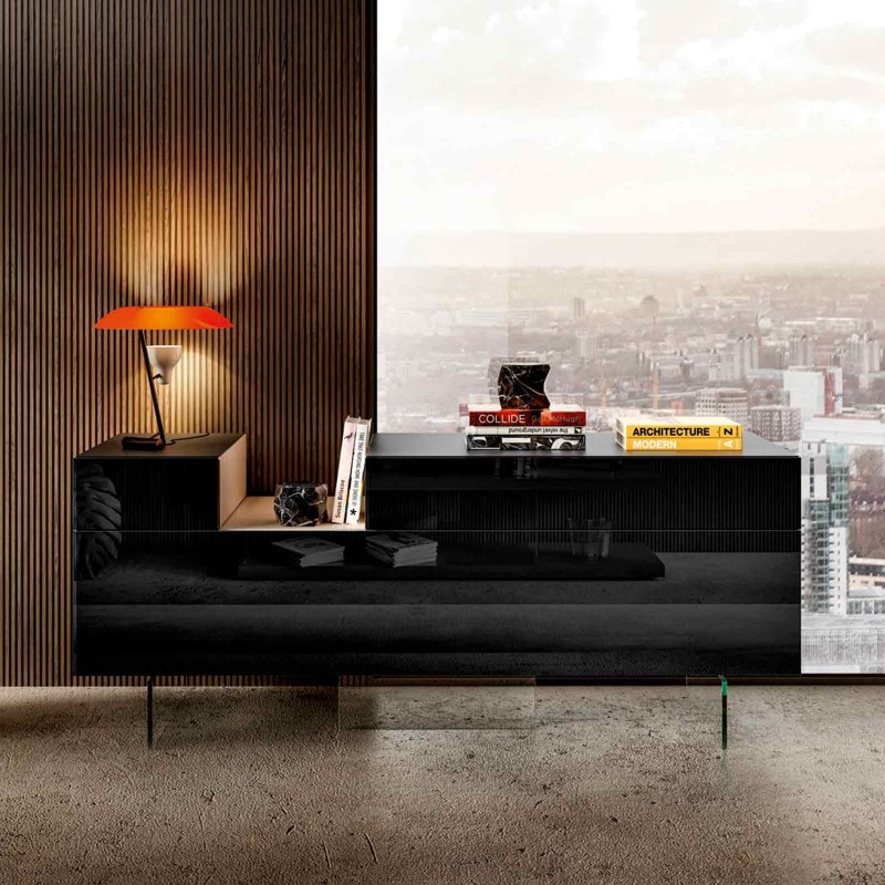 Le buffet est proposé selon la configuration et avec les finitions de la photo: en verre laqué noir et couleur paille sur les côtés. N'hésitez pas de nous contacter pour plus d’informations ou pour un devis personnalisé.