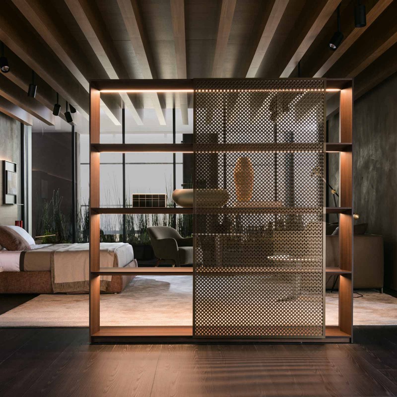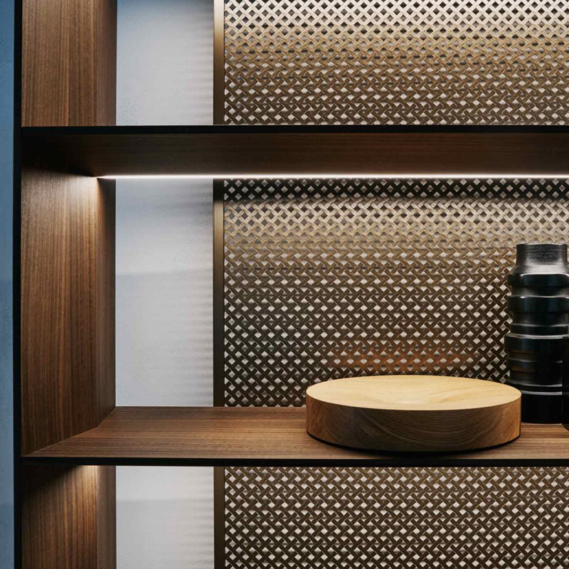 Conçue par Foster + Partners pour Molteni & C, Ava est une bibliothèque à forte connotation innovante. La structure externe est en essence d'eucalyptus, le dossier est en tôle d'aluminium finition bronze avec décoration perforée grâce à la découpe laser. Étagères structurelles en panneaux multicouches, renforcées d'aluminium et modelées avec la technique du pliage.