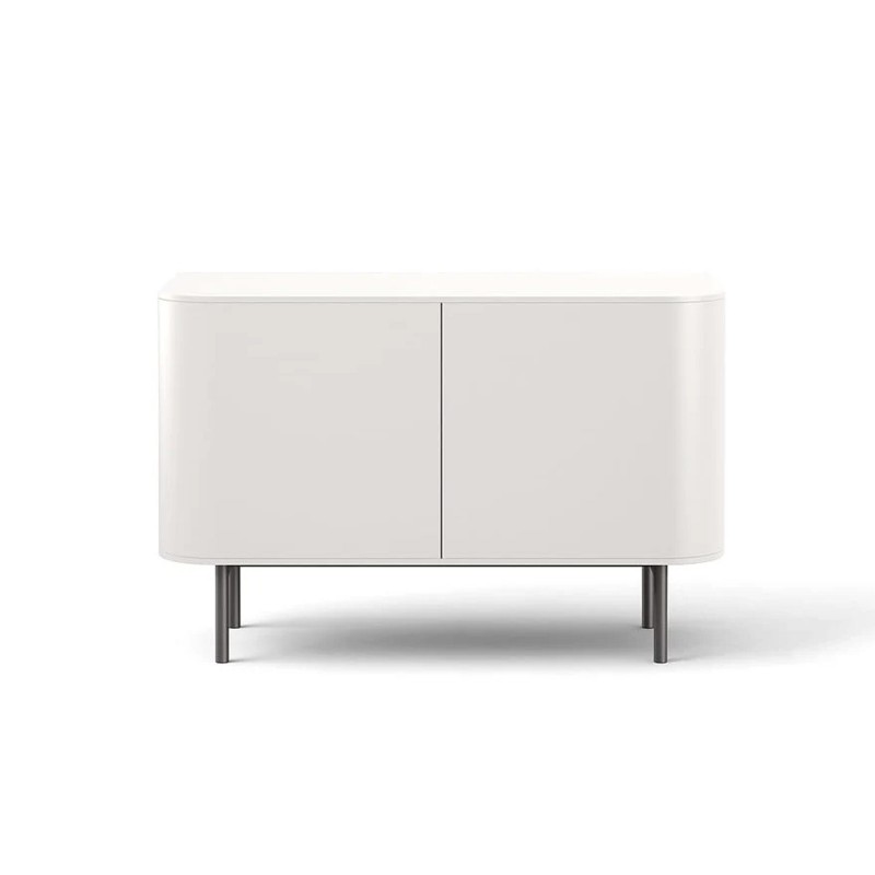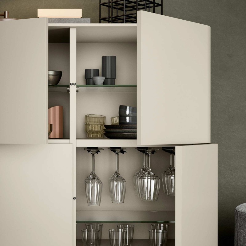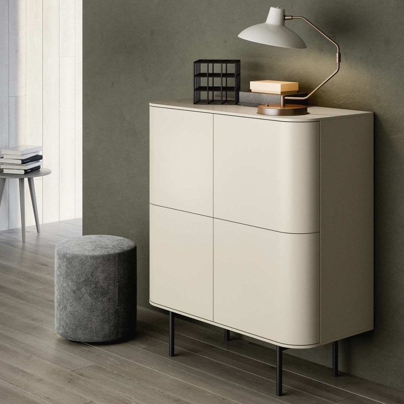Fjord est le buffet de Novamobili qui succombe à la flatterie de l'esthétique de l'ameublement des années 1960. La rigueur des volumes géométriques est en effet adoucie par la sinuosité des portes incurvées. Fjord est disponible dans différentes compositions, ici proposées en deux hauteurs dans la version meuble de rangement.