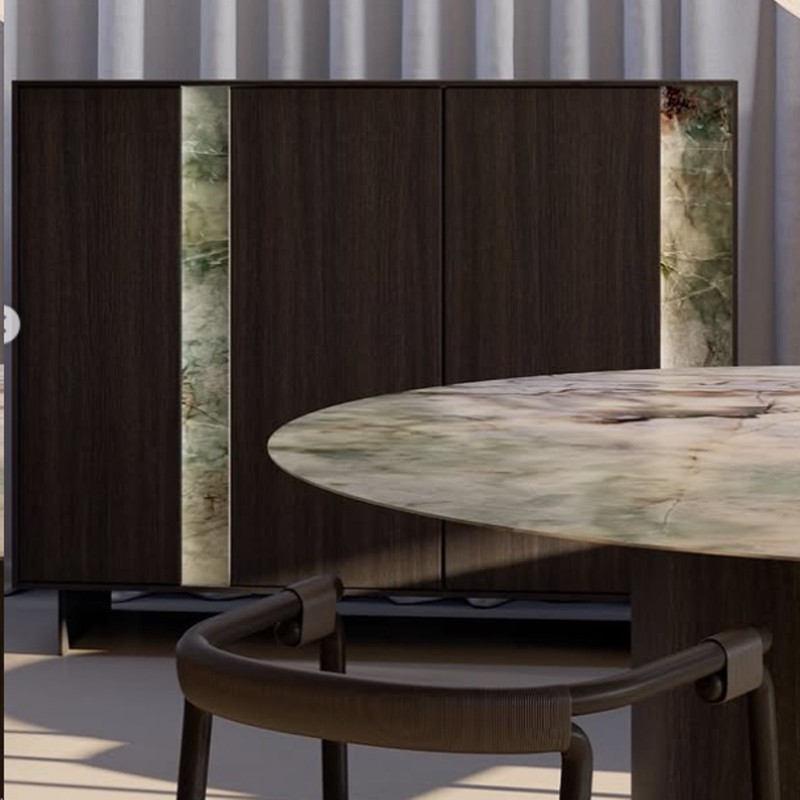 Vertical est la solution innovante d'ouverture verticale sans poignée de Modulnova. Dans le système Vertical, la porte dépasse de 5 cm et cache une source lumineuse à LED qui souligne le jeu des pleins et des vides. Dans ce buffet Vertical, le contraste entre deux matériaux naturels qui, placés en dialogue l'un avec l'autre, créent un mélange d'une élégance absolue : ce sont les éléments en quartz Aqualight de l'essence de noyer. À l'intérieur, le buffet Vertical est soigneusement conçu avec des étagères en verre, un miroir en bronze et du cuir Testa di Moro. Les côtés, les plateaux et les portes sont caractérisés par des épaisseurs minces de 2 cm.