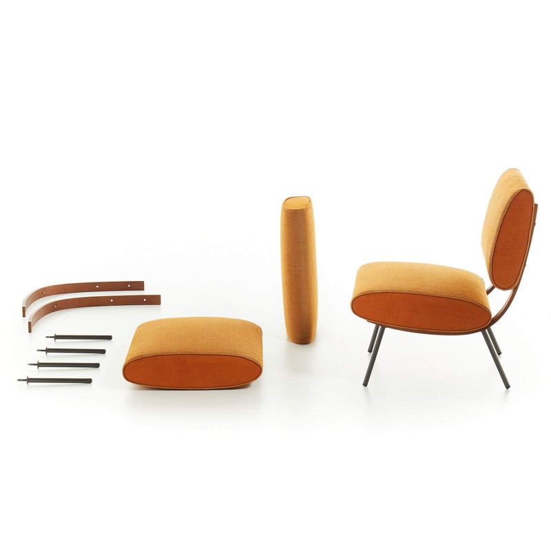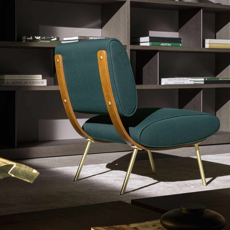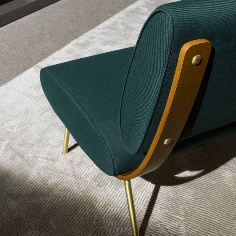 Caractérisé par une structure en contreplaqué de frêne et des pieds en chrome noir ou laiton satiné, le fauteuil Round D.154.5 peut être tapissé dans tous les tissus et cuirs de la gamme Molteni & C.