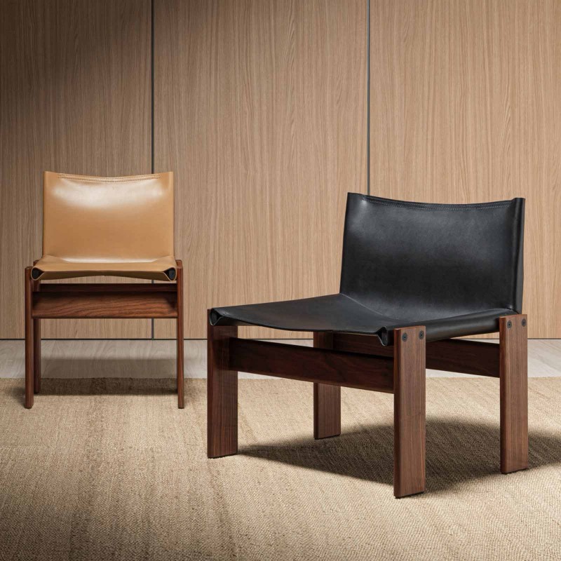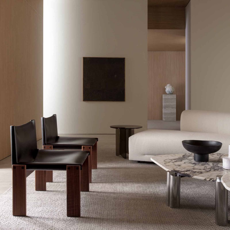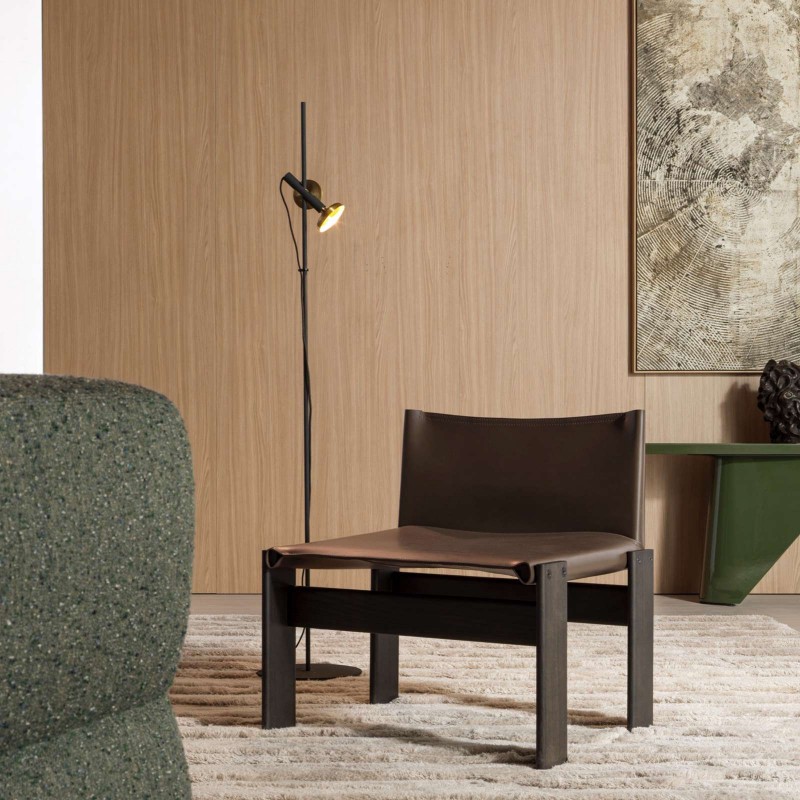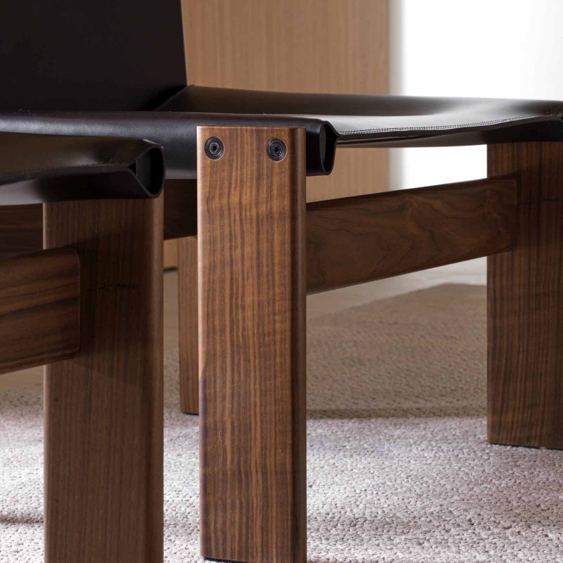 Un projet de 1973 d'Afra et Tobia Scarpa revient dans la collection Molteni&C en 2025: il s'agit du fauteuil Monk, réédité en exclusivité pour la Heritage Collection. Les caractéristiques originales du siège ont été conservées : Monk a une structure en noyer américain massif, disponible en finition chêne café ou chêne noir, composée de deux tréteaux identiques attachés à des tubes métalliques façonnés qui créent un seul élément pour le dossier et l'assise. Huit rivets en acier fixent la structure à l'assise, ajoutant une finition décorative subtile à ce modèle qui évoque un style simple et élégant. Le revêtement est disponible en cuir.