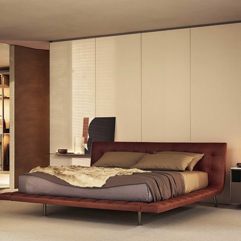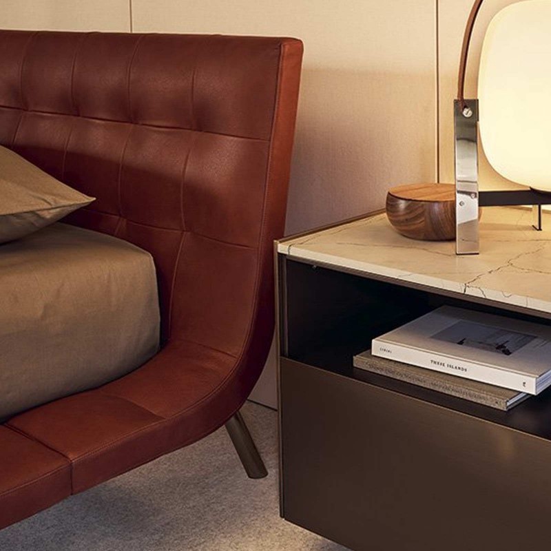 Onda est le lit de Paolo Piva pour Poliform. À la base du concept Onda se trouve une seule ligne incurvée qui remplit la fonction de tête de lit et de plate-forme, soutenue par des pieds en métal léger. Onda est embelli par le rembourrage en damier matelassé, réalisé exclusivement à la main. Finition des pieds : nickel brun