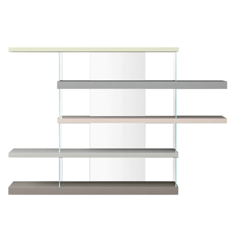 La composition de la bibliothèque Air proposée est celle de la photo: des éléments de rangement en verre brillant châtaignier, amande et lilas.