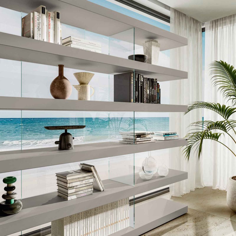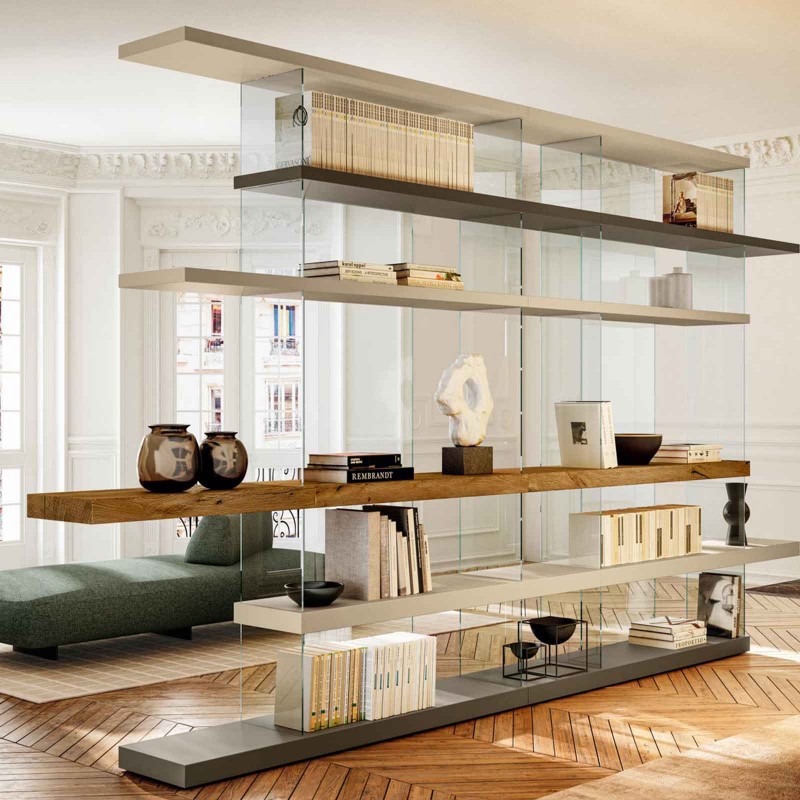 La bibliothèque Air par Lago se fonde sur une redéfinition de l’espace de la maison en concevant de nouveaux rapports entre les pleins et les vides, la légèreté et la densité, en les inversant. Ce sont les structures portantes qui évoquent en effet la légèreté, tandis que les volumes sont surtout conférés par les étagères et les éléments de rangement. Avec Air, Lago a créé un produit qui s’adapte bien à beaucoup d’ambiances, grâce à son caractère autoportant qui évite l’ancrage mural. En outre, cette bibliothèque, en plus d’être placé au centre de la pièce, est parfaite même pour les ambiances peu lumineuses: en effet, le verre laisse passer la lumière et la reflète dans toute la pièce, l’inondant ainsi de lumière.