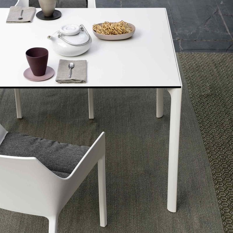 Maki est ici proposé en version extensible d'une profondeur de 80 cm et plateau en stratifié Alucompact® et stratifié Pure-White, Fenix-NTM®