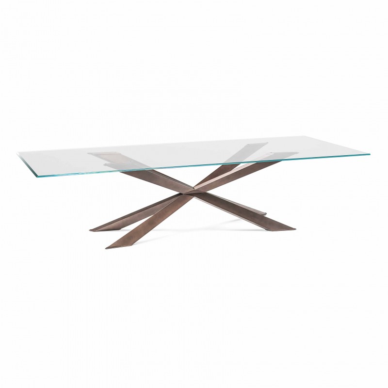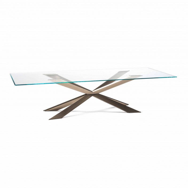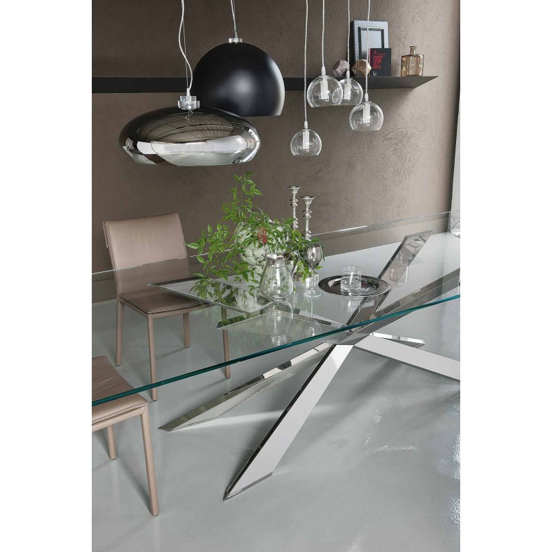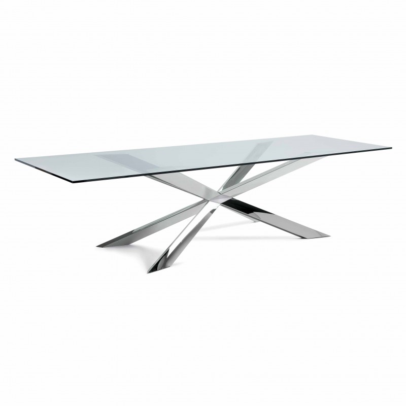 Spyder par Cattelan Italia possède un plateau en cristal de 15 mm d’épaisseur. Les petites irrégularités de réflection sur la base en acier sont dues au travail manuel.