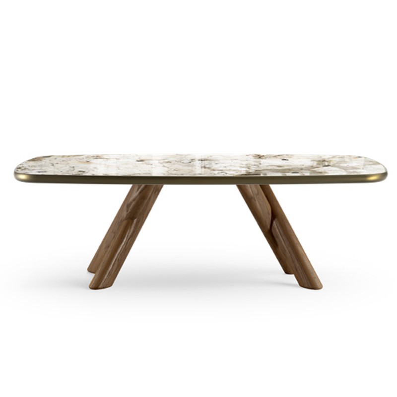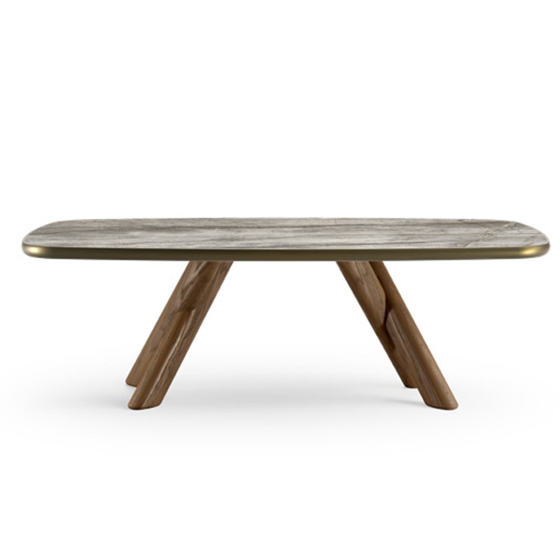 La version du plateau en céramique King se caractérise par un profil arrondi laqué disponible dans les finitions titane, bronze et ivoire, qui entoure complètement le plateau, une caractéristique distinctive des collections de tables Eforma.