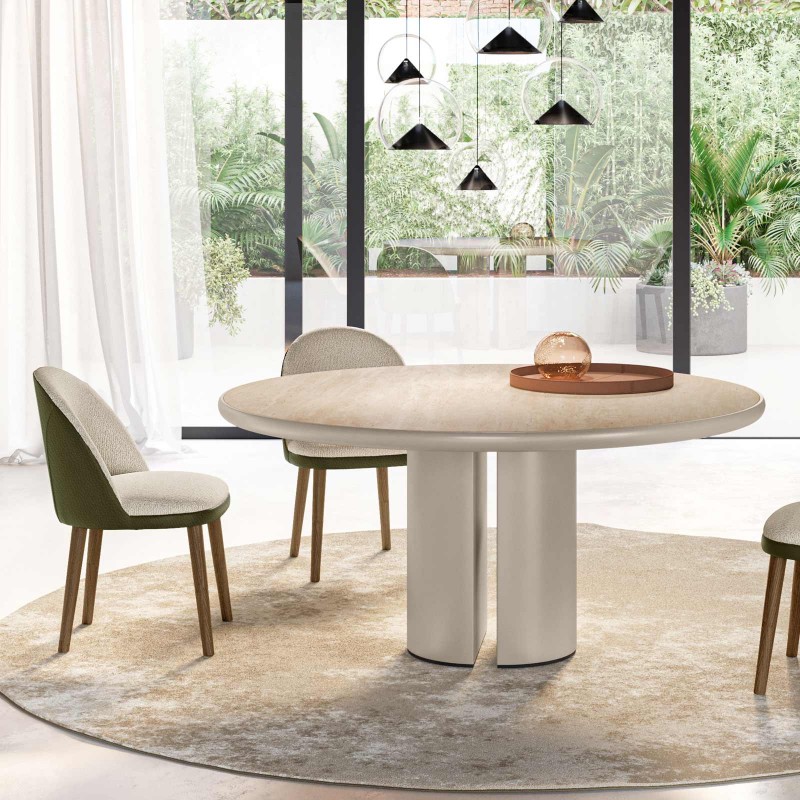 Dora est la nouvelle table 2024 d'Eforma, qui se distingue par l'utilisation de matériaux précieux et de formes essentielles. Le plateau circulaire est disponible en 140 et 160 cm de diamètre, la base est sculpturale mais discrète : deux éléments métalliques arrondis. L'allure raffinée de Dora passe également par le bord King qui entoure tout le plateau, disponible en différentes finitions céramiques.