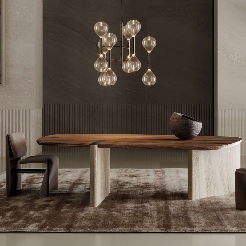 Ici, Flatiron Table est proposée dans la version avec base en marbre Travertino, plateau en noyer Canaletto et insert métallique en bronze, mais elle est également disponible dans un seul matériau pour se fondre dans les différents styles d'environnements résidentiels.