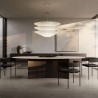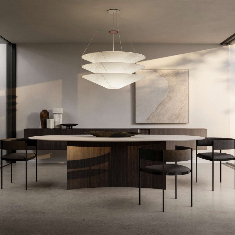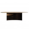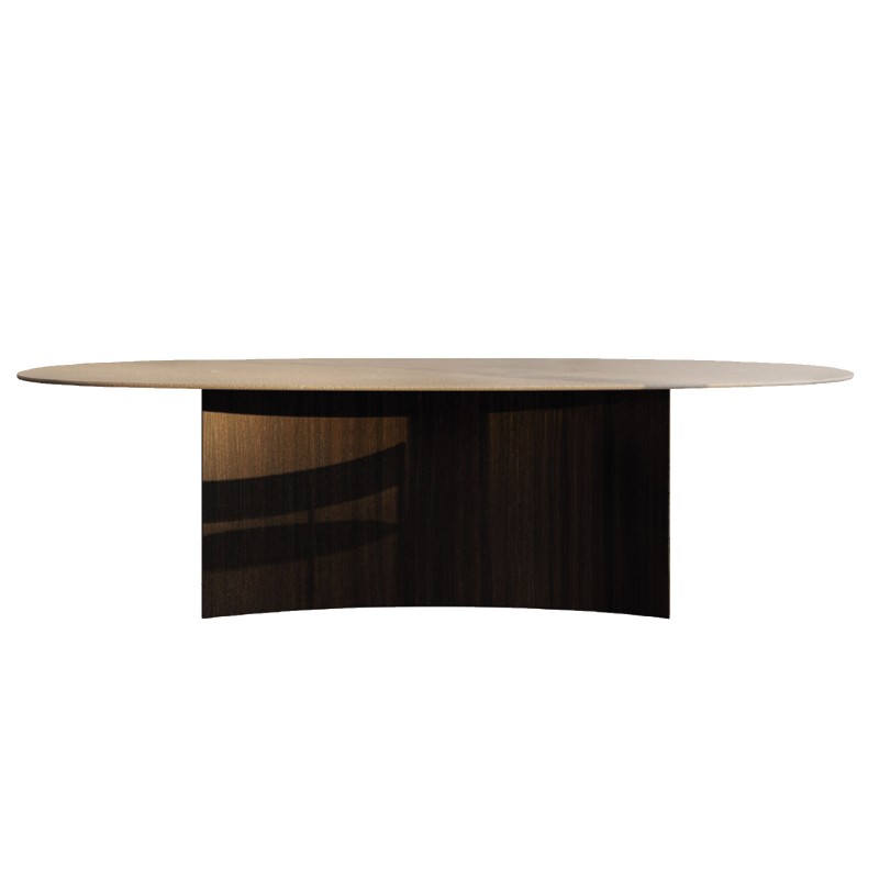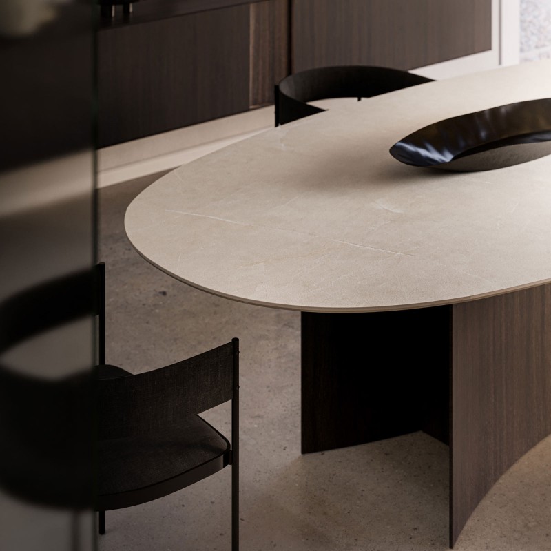 Le piètement, solide mais visuellement léger, dialogue avec le plateau en créant un équilibre structurel qui exalte la perception de suspension et de continuité. Le résultat est une table à fort impact architectural, capable de s’intégrer naturellement dans des espaces de vie sophistiqués. Sur la photo, le plateau ovale est réalisé en grès Gold Pearl, tandis que la structure est revêtue de bois de noyer Moka à veines verticales.