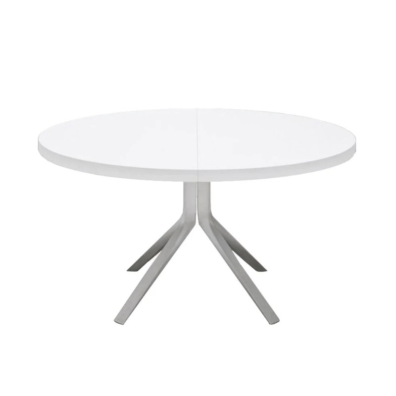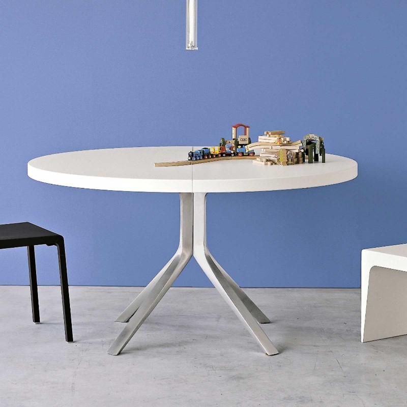 Oops est la table extensible avec base en aluminium et plateau en MDF laqué blanc de 5 cm d'épaisseur conçue par Monica Graffeo pour Kristalia. Rond, il est disponible en deux tailles et une fois allongé il prend une forme ellipsoïdale. Les pieds sont en fonte d'aluminium.