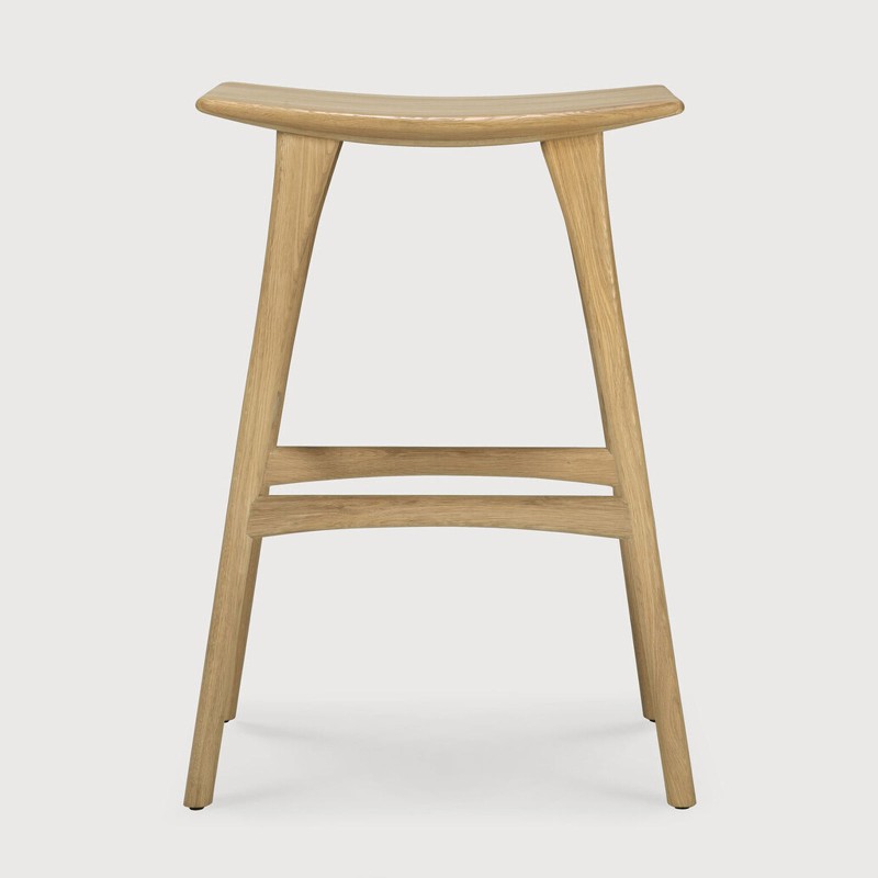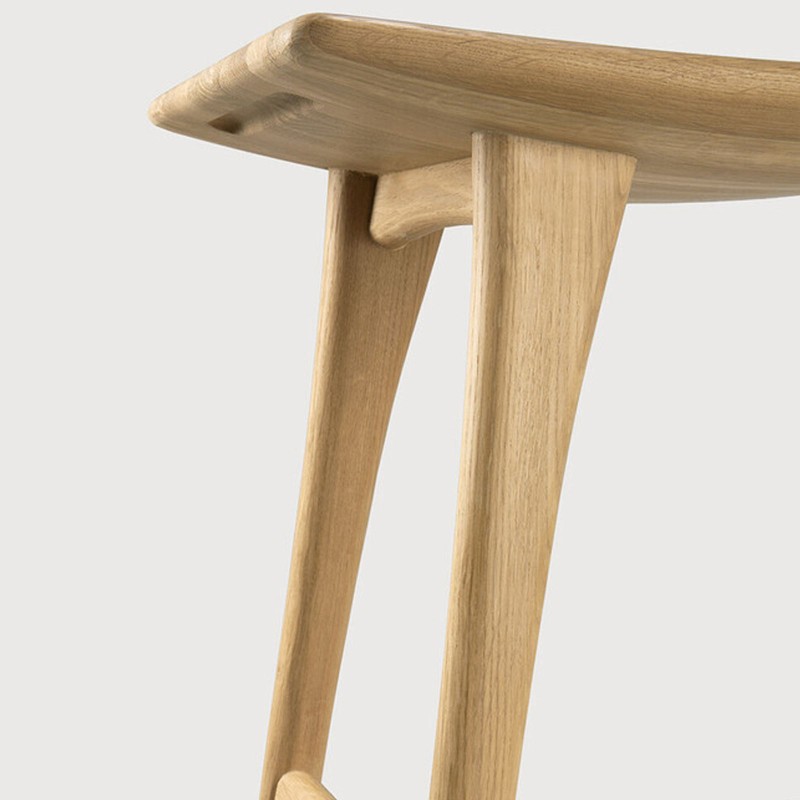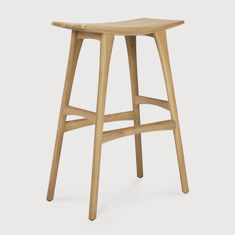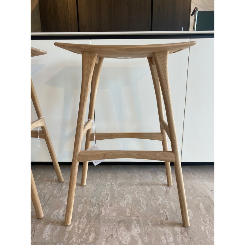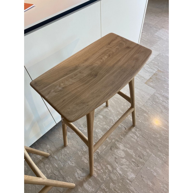 Osso d'Ethnicraft est le tabouret dont la fabrication en chêne massif est mise en valeur par son design essentiel. Dans cette configuration de prix outlet pour expo rénovation, Osso est proposé en version bar, avec une hauteur adaptée à un plan snack, un îlot, une table haute ou un poste de travail.