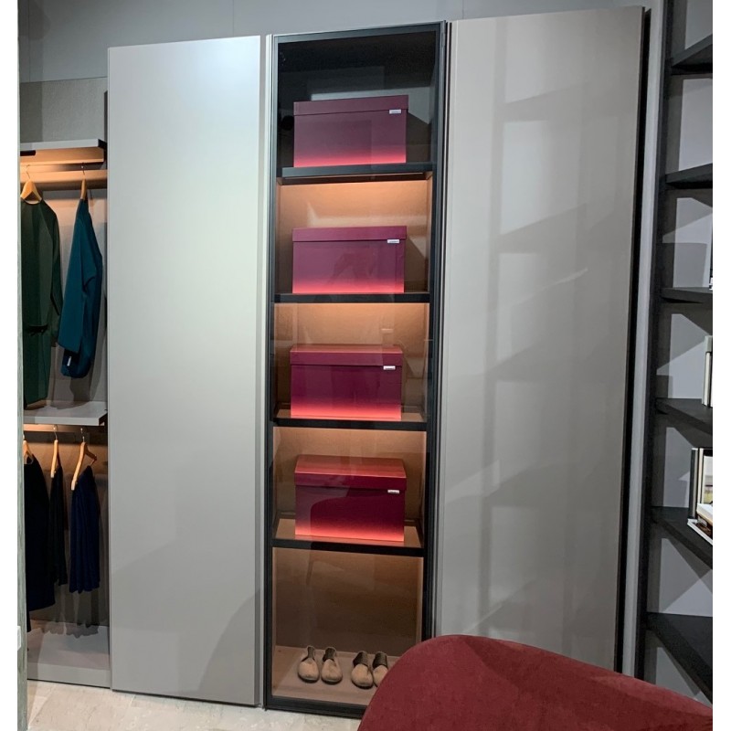 L'armadio Perry di Novamobili con ante a battente laccate e in vetro si caratterizza per alternare contenimento ed esposizione.