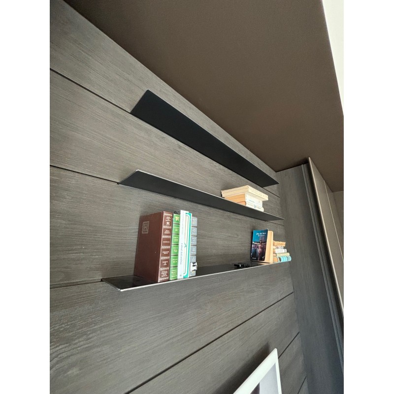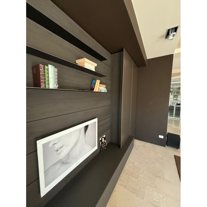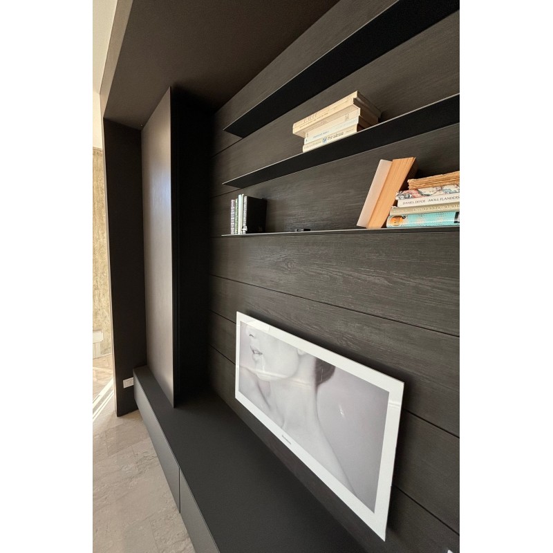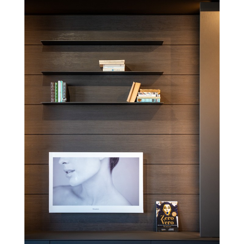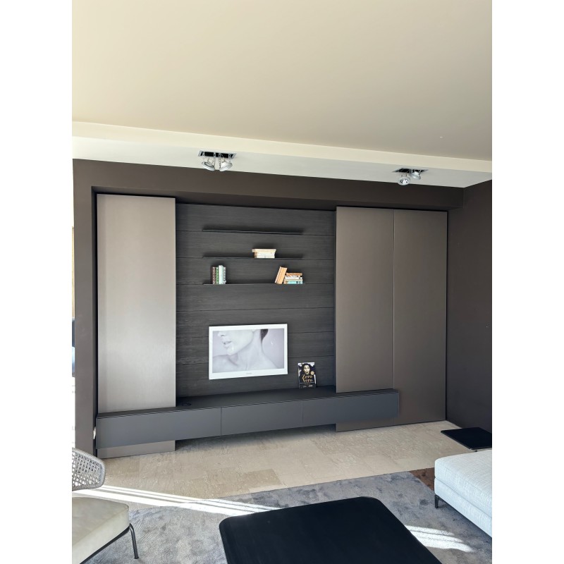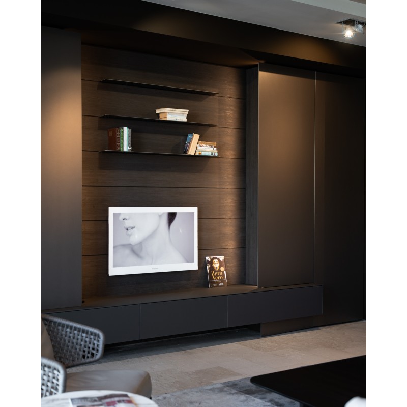 Le salon MH6 de Modulnova est un salon moderne et minimaliste qui se distingue par des éléments de rangement et des boiseries avec étagères de présentation.