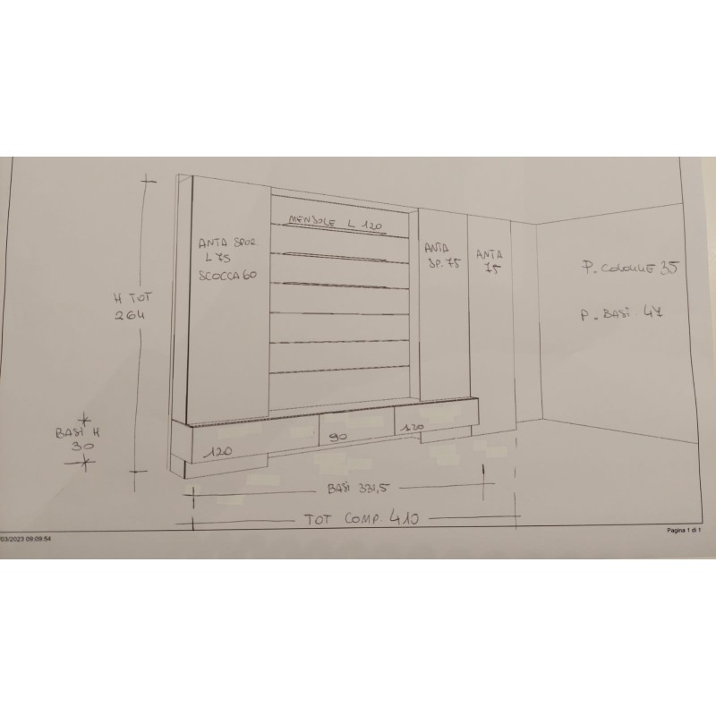 L 410 x P 35 (colonnes) x H 264 cm - P 48 cm éléments bas