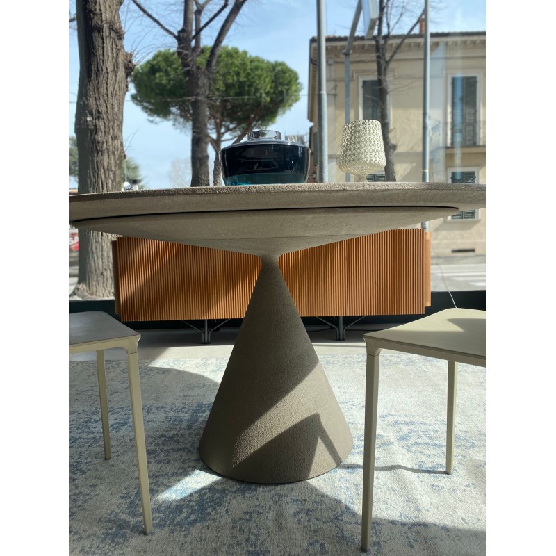 La table Clay de Desalto se distingue par l'effet monolithique de son plateau et de sa base. Il s'agit d'une table ronde sculpturale avec une finition spatulée texturée, capable de donner une forte personnalité aux environnements résidentiels.
