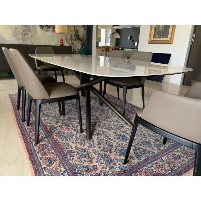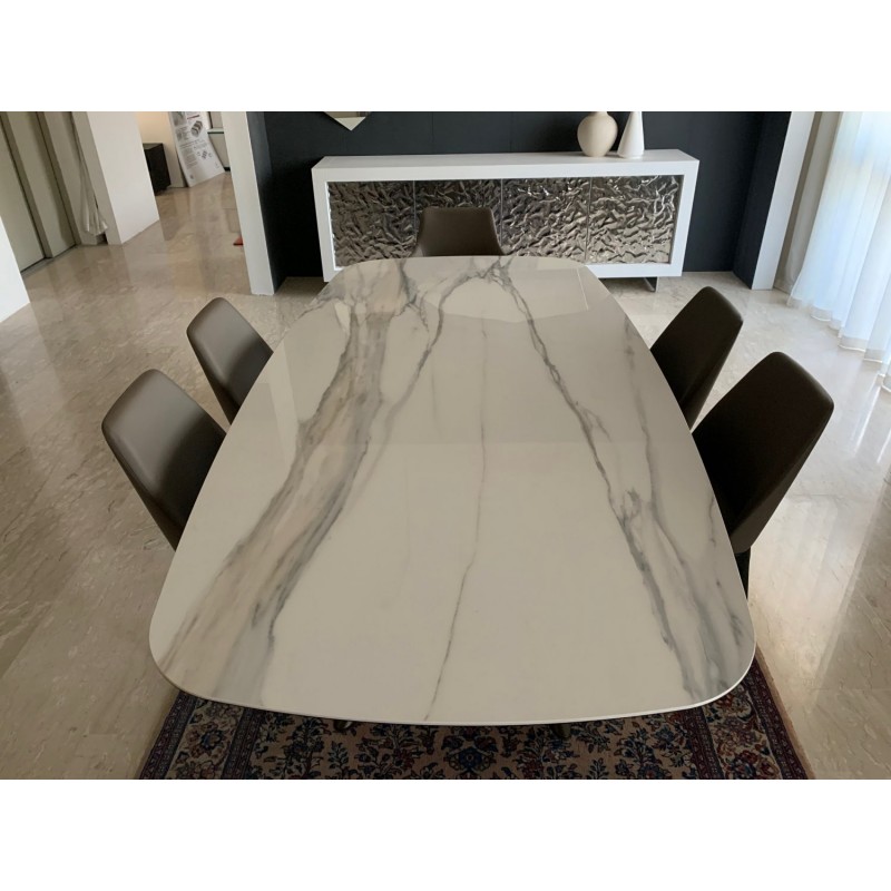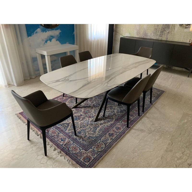Baly di Eforma, marchio veneto che si contraddistingue per una spiccata lavorazione artigianale e cura dei dettagli, è un elegante tavolo con piano a botte in ceramica Calacatta gold lucido (ceramica sp. 6 mm accoppiata con vetro temperato sp. 10 mm) e base scultorea che consiste in un sofisticato incrocio di aste in metallo verniciato bronzo.