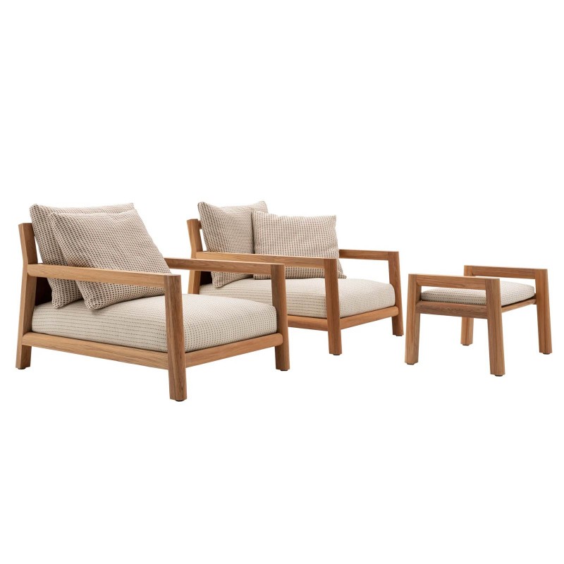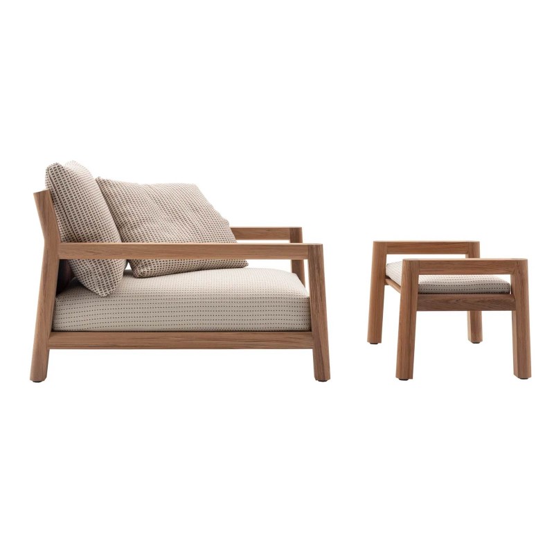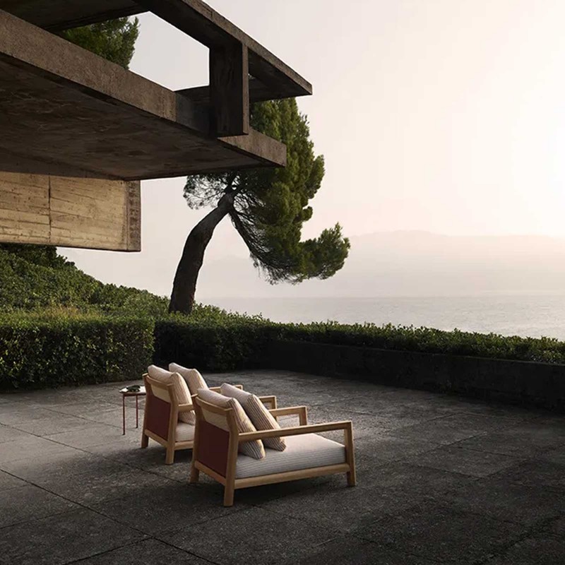 Pablo est la première collection outdoor de Vincent Van Duysen pour B&B Italia. Un projet aux géométries proportionnées, décliné en fauteuil en deux profondeurs, canapé, repose-pieds et table basse. Attaché au minimalisme et à la noblesse des matériaux, Pablo se caractérise par la structure en teck, reconnue pour ses performances techniques et sa résistance aux intempéries. Pablo est un équilibre parfait entre recherche stylistique et fonctionnalité: la structure ne présente aucune interruption, favorisant le maintien du bois, ainsi que les panneaux arrière en tissu, qui sont facilement démontables pour un entretien plus facile. Des astuces qui font de Pablo une collection apparemment simple, mais pleine de détails à apprécier.