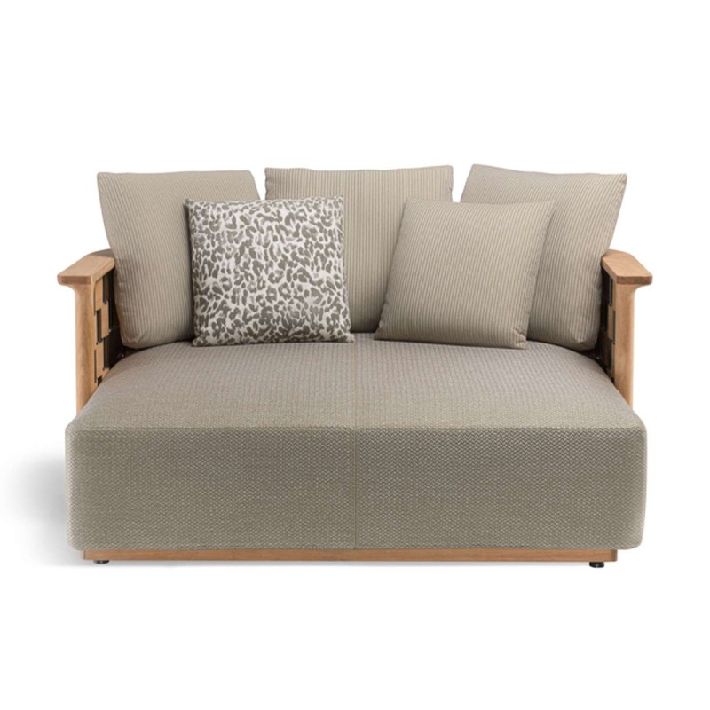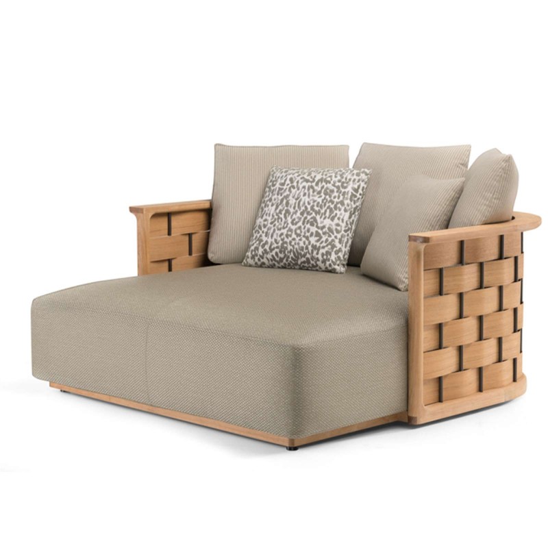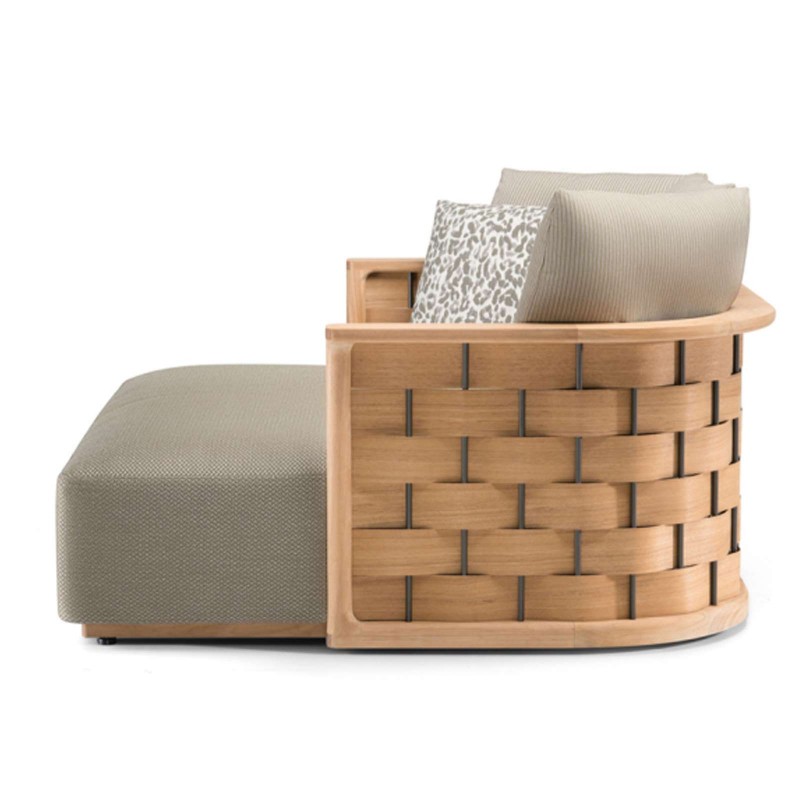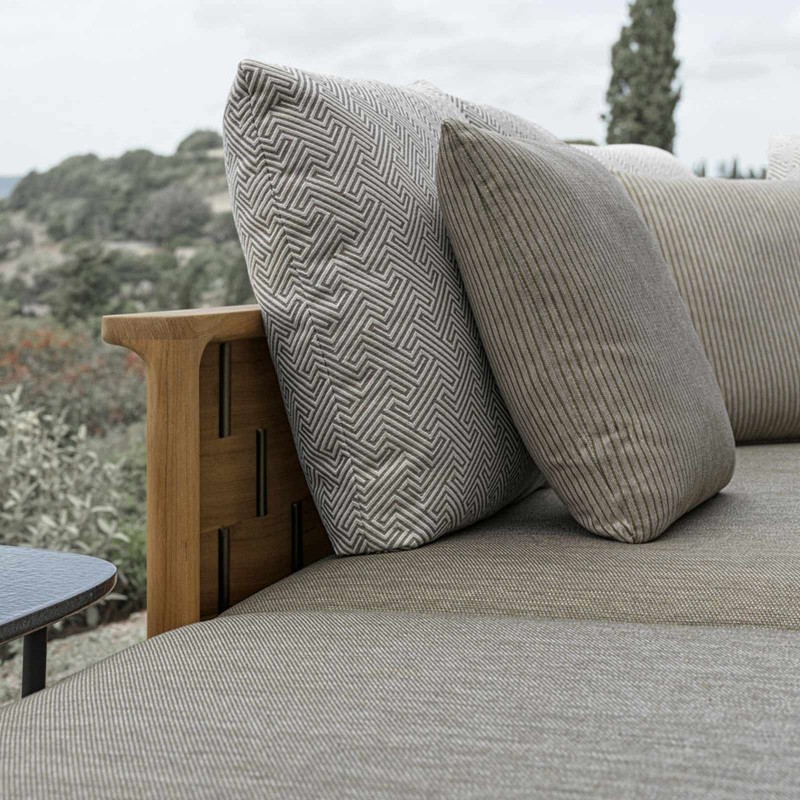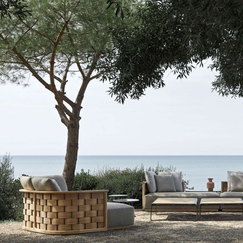 Palinfrasca est la série de meubles rembourrés conçue par Vincent Van Duysen pour la première collection outdoor de Molteni&C. D'une esthétique moderne mais rassurante, Palinfrasca se caractérise par une structure incurvée en teck massif agrémentée d'un motif tissé en trame élargie, disponible en teck ou en polyuréthane EVA vert olive.