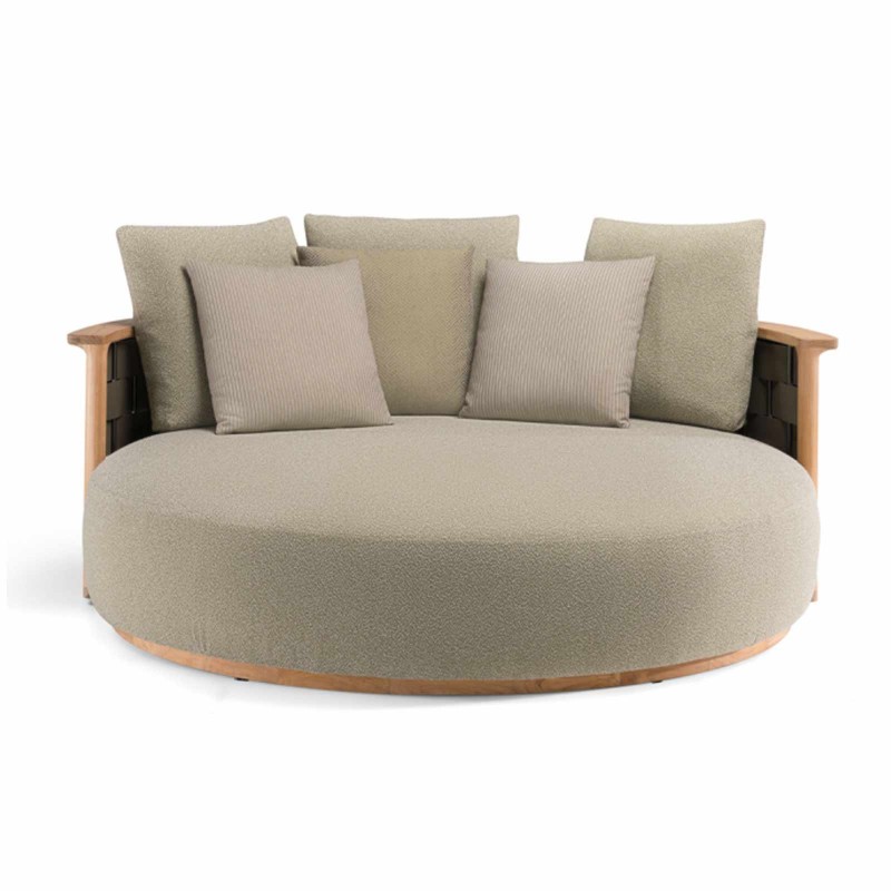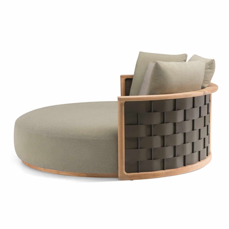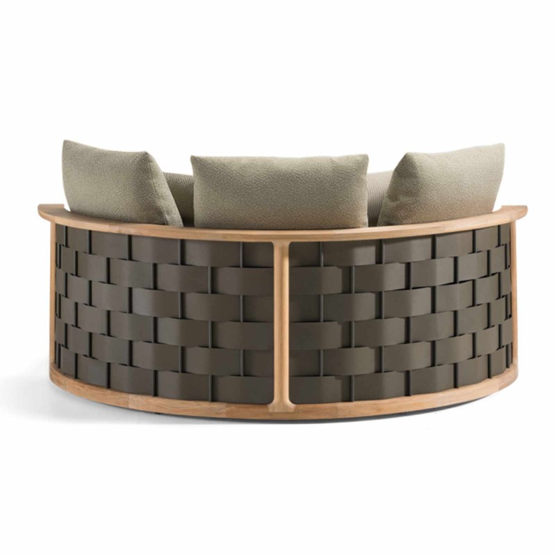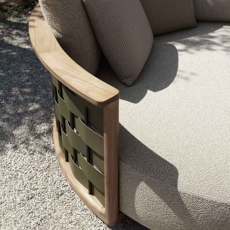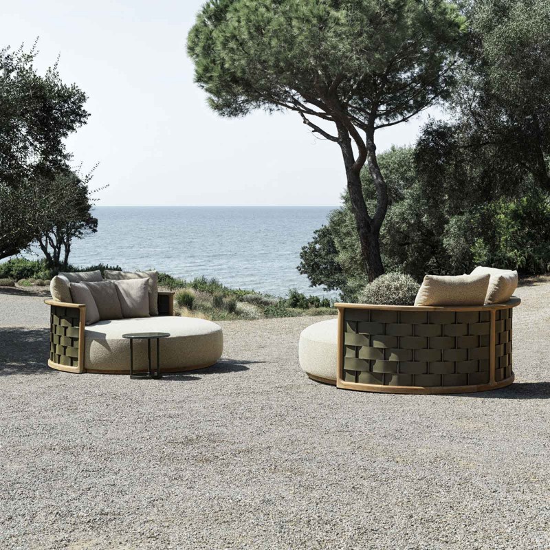Palinfrasca est la série de meubles rembourrés conçue par Vincent Van Duysen pour la première collection outdoor de Molteni&C. D'une esthétique moderne mais rassurante, Palinfrasca se caractérise par une structure incurvée en teck massif agrémentée d'un motif tissé en trame élargie, disponible en teck ou en polyuréthane EVA vert olive.