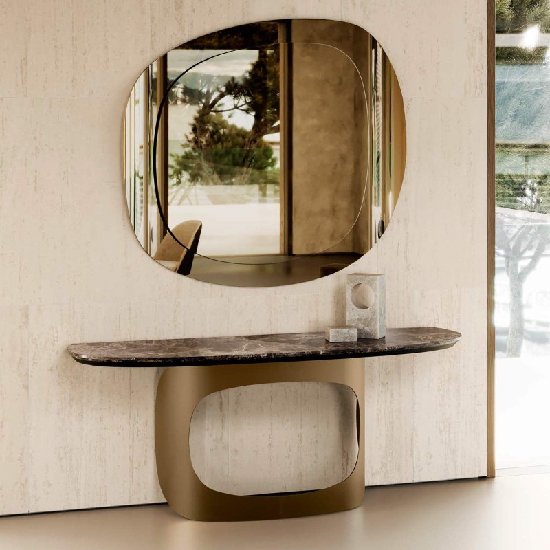 Avec la collection 2024 présentée au Salone del Mobile 2024 à Eforma, la marque poursuit son chemin en élargissant sa gamme de produits. C'est le cas de la série Polifemo, qui reprend la figure mythologique célèbre pour son grand œil central, un trait physique qui est transporté dans un anneau arrondi avec un fort aspect sculptural, d'abord dans la table et maintenant aussi dans d'autres accessoires d'ameublement. Dans la nouvelle console Polifemo, l'élément décoratif inspiré de Polyphème sert de base au plateau façonné disponible en marbre ou en céramique.