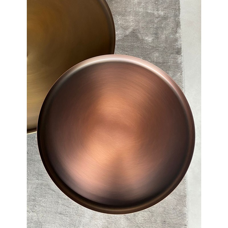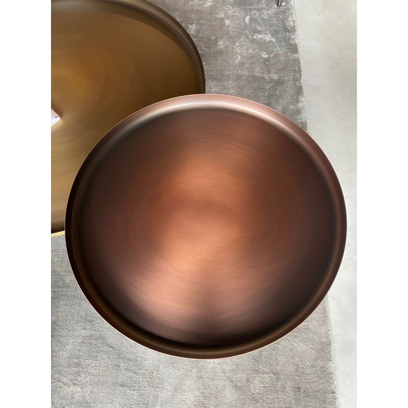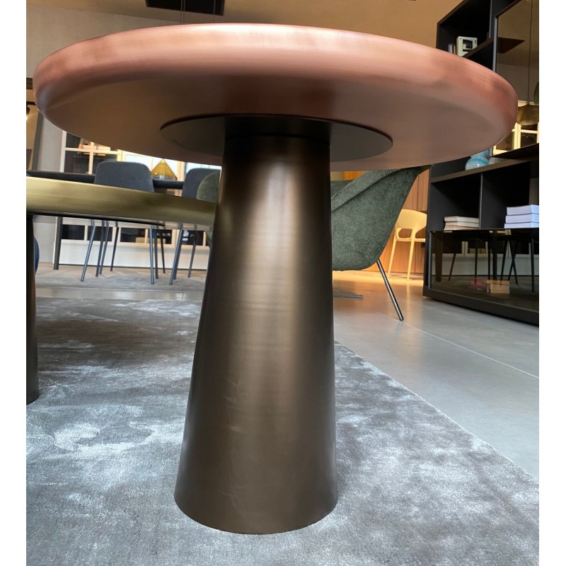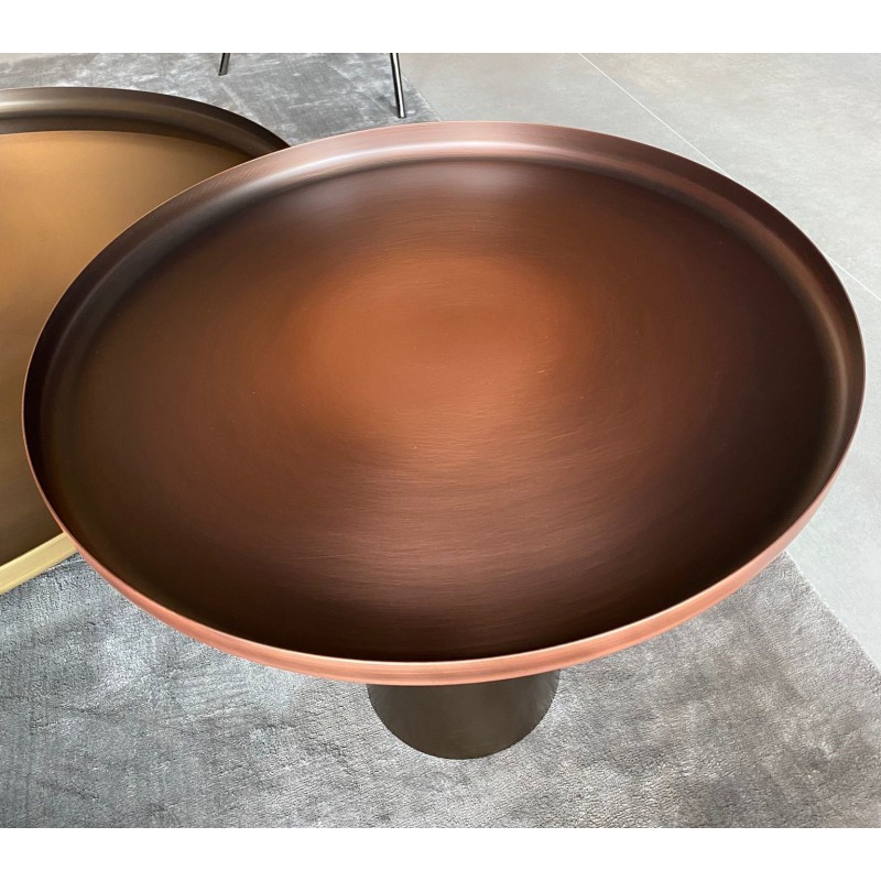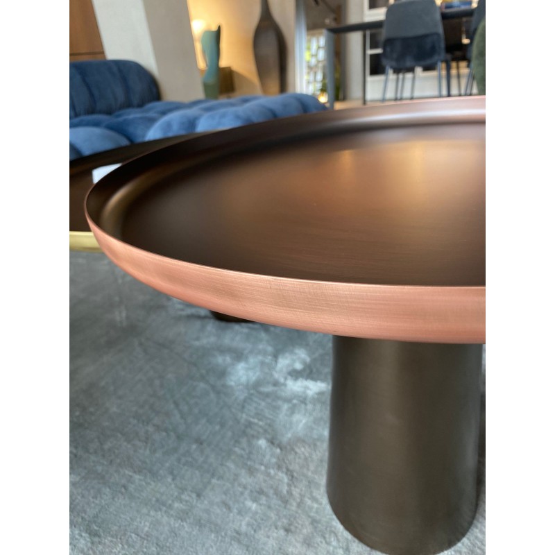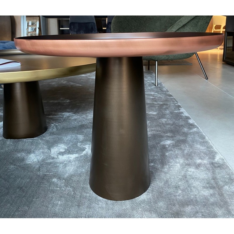 La table basse Sunset de De Castelli se caractérise par le plateau circulaire où le métal, matériau de prédilection de la marque, s'exprime dans toute sa pureté et son travail manuel et son oxydation, avec une teinte elliptique vers le centre. Le plateau contraste avec le fer DeLabré du piètement.