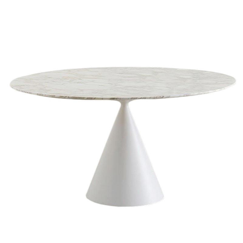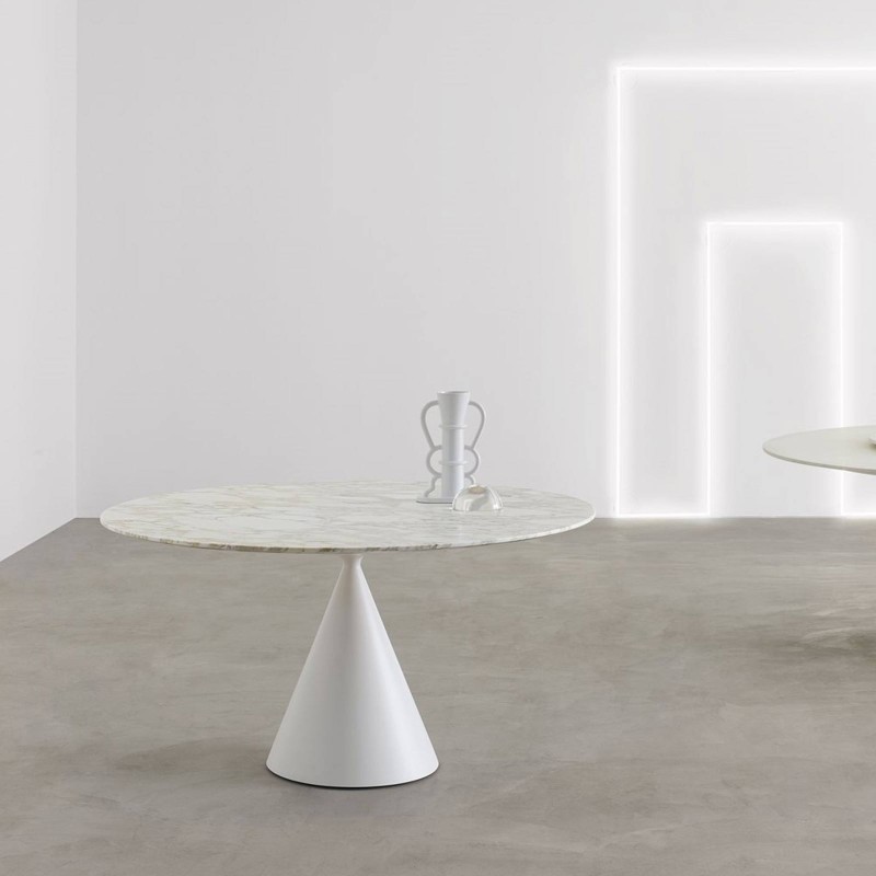 Clay by Desalto est la table présentée au Salone del Mobile 2015, conçue par Marc Krusin. Sculpture contemporaine qui remplit la fonction d'un accessoire d'ameublement pratique avec un impact esthétique, Clay est la célébration de formes géométriques pures où deux cônes aux volumes différents en parfait équilibre se rencontrent au point le plus fin. Dans ce défi à la gravité, Clay redonne un tout nouveau design à la table ronde et ovale classique, soulignée par les finitions sophistiquées. Ici proposé dans la finition piètement double laqué ou spatulé avec plateau en céramique effet marbre. Et le résultat est unique.