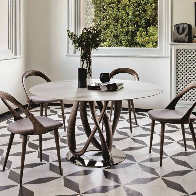 Infinity de Porada est une table à manger avec base en noyer canaletta massif monté sur une plaque en métal et plateau en marbre (épaisseur mm. 12). Un complément monumental où la particularité est toute dans l'enchevêtrement scénographique d'éléments en bois travaillé, expression de l'excellent savoir-faire de la marque italienne, qui semblent des racines séculaires et qui soutiennent un fin disque de verre.
