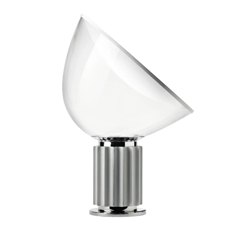 La lampe Taccia de Flos est une icône incontestée du design, signée par Achille et Piergiacomo Castiglioni. Considérée par les designers comme la "Mercedes des lampes", Taccia présente des caractéristiques traditionnelles dans la base en aluminium peint en noir, rappelant une colonne classique. Le diffuseur est une cloche en verre profonde au sommet de laquelle loge un disque concave en aluminium émaillé blanc.