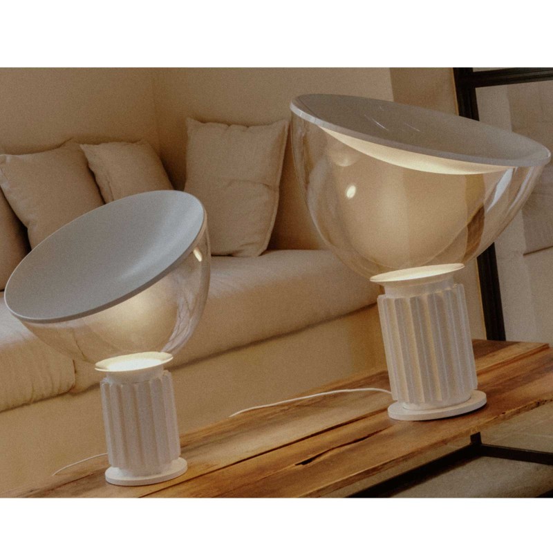 La lampe Taccia Small de Flos est une icône incontestée du design, signée par Achille et Piergiacomo Castiglioni. Considérée par les designers comme la "Mercedes des lampes", Taccia présente des caractéristiques traditionnelles dans la base en aluminium peint en noir, rappelant une colonne classique. Le diffuseur est une cloche en verre profonde au sommet de laquelle loge un disque concave en aluminium émaillé blanc.