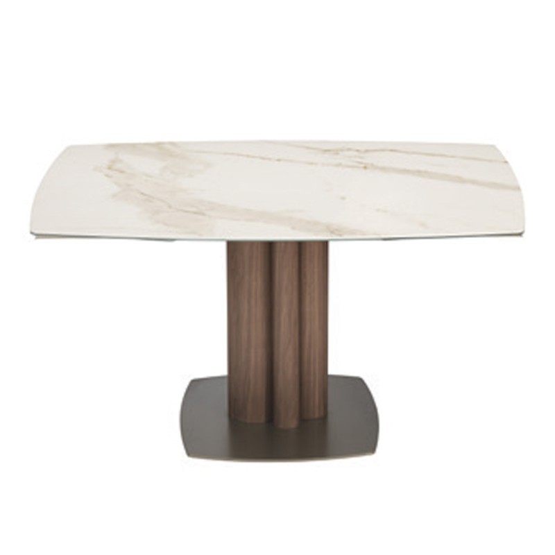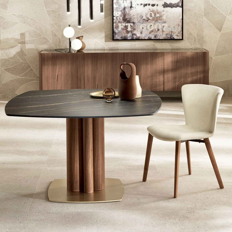 Tower est la table Riflessi qui se distingue par sa base sculpturale composée d'une série de colonnes métalliques cylindriques. Le plateau est en céramique biseautée stratifiée, disponible dans une large gamme de finitions.