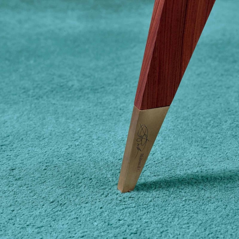 Una piccola opera d'architettura, perfetta nelle proporzioni e negli incastri, così come nel connubio tra palissandro e vetro, in bilico tra leggerezza e geometria solida. Il genio milanese concepì questo tavolino per l'azienda M. Singer&Sons, una delle più importanti di New York, come parte di una collezione destinata al mercato americano. Struttura in legno massello con piedi in ottone satinato e piano triangolare in cristallo extrachiaro.