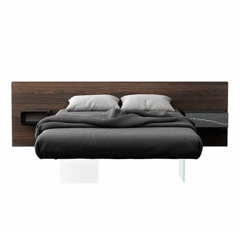 Il letto Air di Lago fa parte dell'omonima collezione di successo che ha reso sospesi gli arredi grazie alle 4 gambe di sostegno in vetro extrachiaro. La sensazione di leggerezza contrasta con la testiera Wildwood: il materico e caldo rovere che sembra un tronco di un albero di 200 anni fa.