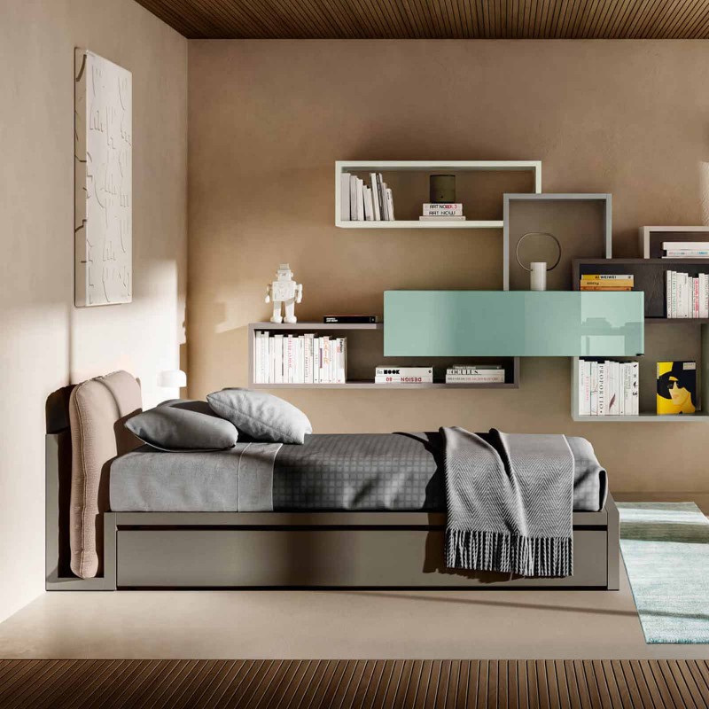 Il letto LagoLinea di Lago è concepito da un'unica linea che ne definisce la struttura. Dal design originale, LagoLinea può essere ancorato a parete o self-standing. In questa versione è proposto con la testiera cuscino disponibile in vari tessuto Lago. È possibile integrare due cestoni estraibili ideali per contenere i propri oggetti o secondi letti con rete estraibile per materasso 85 x 185 cm.